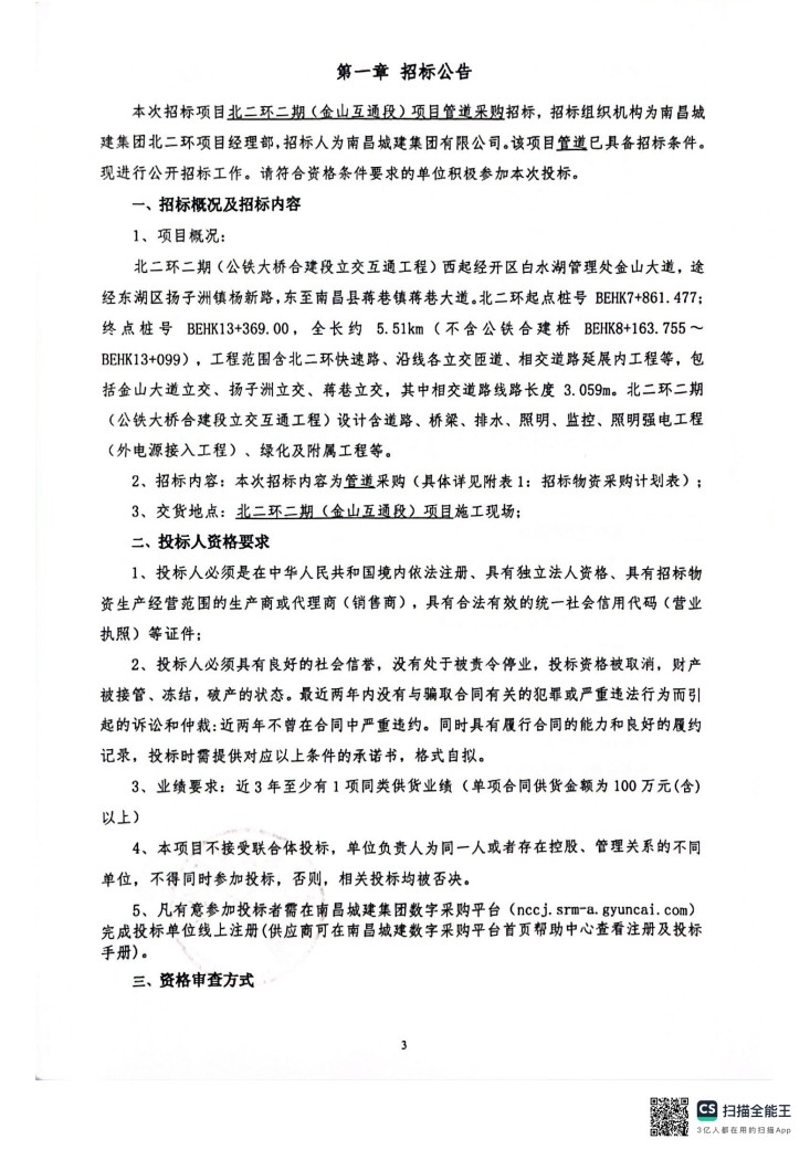 北二环二期(金山互通段)项目管道采购招标公告