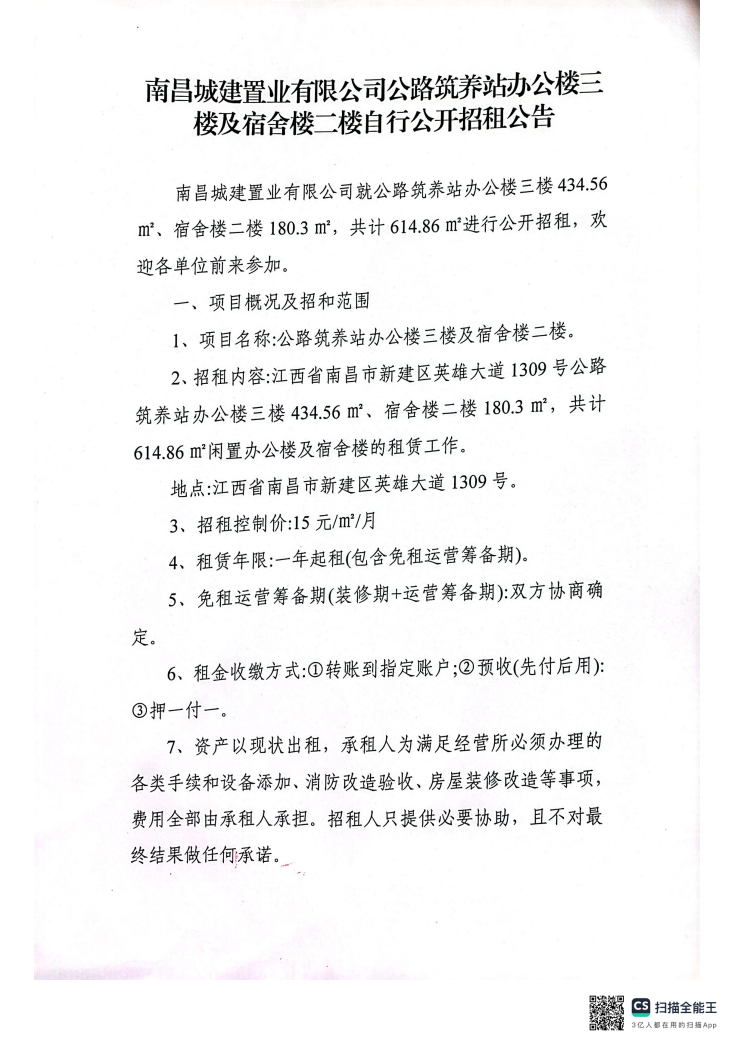 必赢亚州242.net公路筑养站办公楼三楼及宿舍楼二楼自行公开招租公告