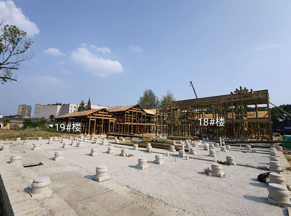六尺巷项目于2019年3月开工,基础部分已全部完成。今年受疫情及梅雨季节的影响,项目部所有员工及施工班组在做好疫情防控的同时,克服困难,加班加点,努力改变复工不复产的局面,不定时召开生产协调会,推荐项目进度。目前,吴府地块地下预埋已全部完成,地面磉石已完成24#楼,28#楼,地面木结构已完成29#楼、18#楼、19#楼。张府木结构施工队伍已确定并入场勘察,近期将进场施工,项目已完成产值2048.21万。