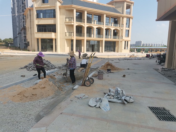 截止十一月底,已完成小区入户铺装及广场全部铺装3000㎡;围墙基础浇筑及围墙铁艺500余米;路缘石铺设共计1400m;景观绿化10000㎡,其中小苗4000㎡、草坪6000㎡,乔木900余株,以香樟、桂花、水杉为主,灌木118株。应业主要求已完成新增临时混凝土道路1800㎡。目前施工队正在加紧清理施工面建筑垃圾,从而进行沥青铺摊,完成最后的收尾工作。