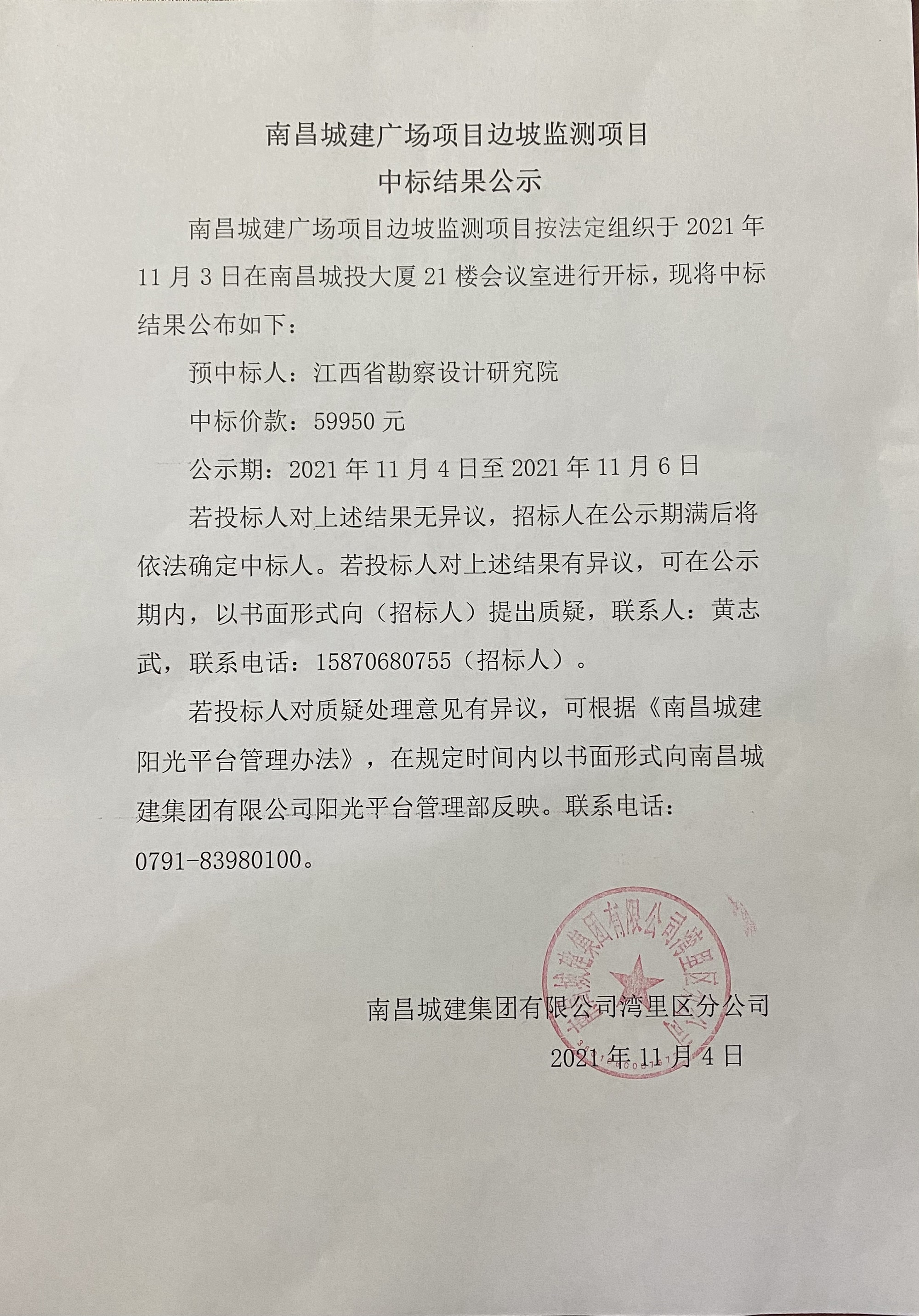 必赢亚州242.net广场项目边坡监测项目按法定组织于2021年11月3日在南昌城投大厦21楼会议室进行开标,现将中标结果公布如下: