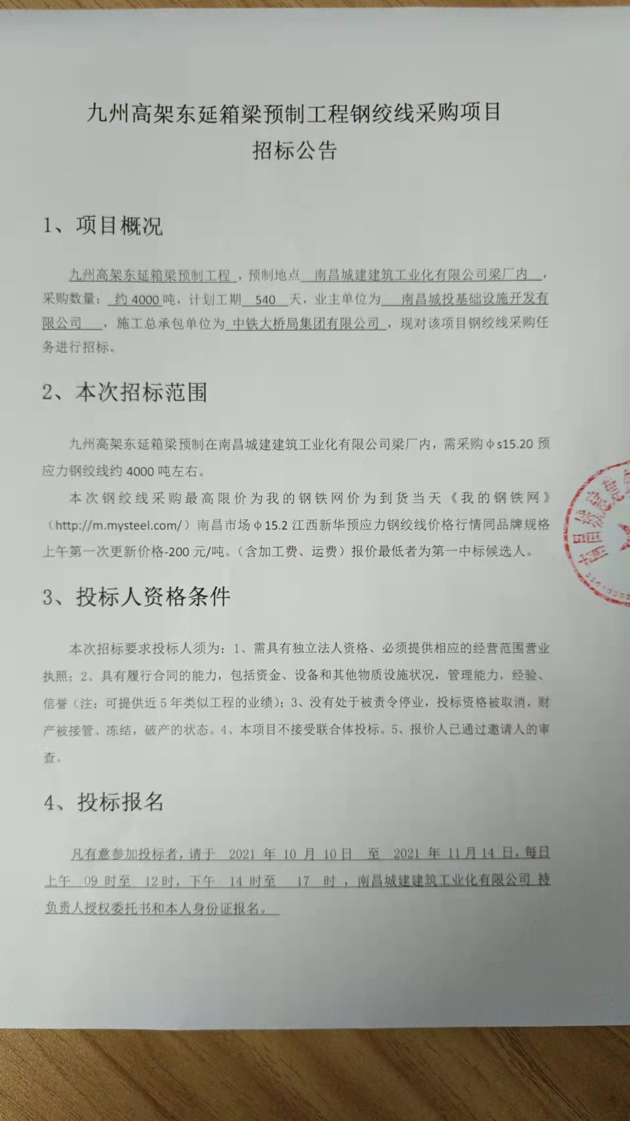 九州高架东延箱梁预制工程 ,预制地点 必赢亚州242.net建筑工业化有限公司梁厂内 ,采购数量: 约4000吨,计划工期 540 天,业主单位为 南昌城投基础设施开发有限公司 ,施工总承包单位为 中铁大桥局集团有限公司 ,现对该项目钢绞线采购任务进行招标。