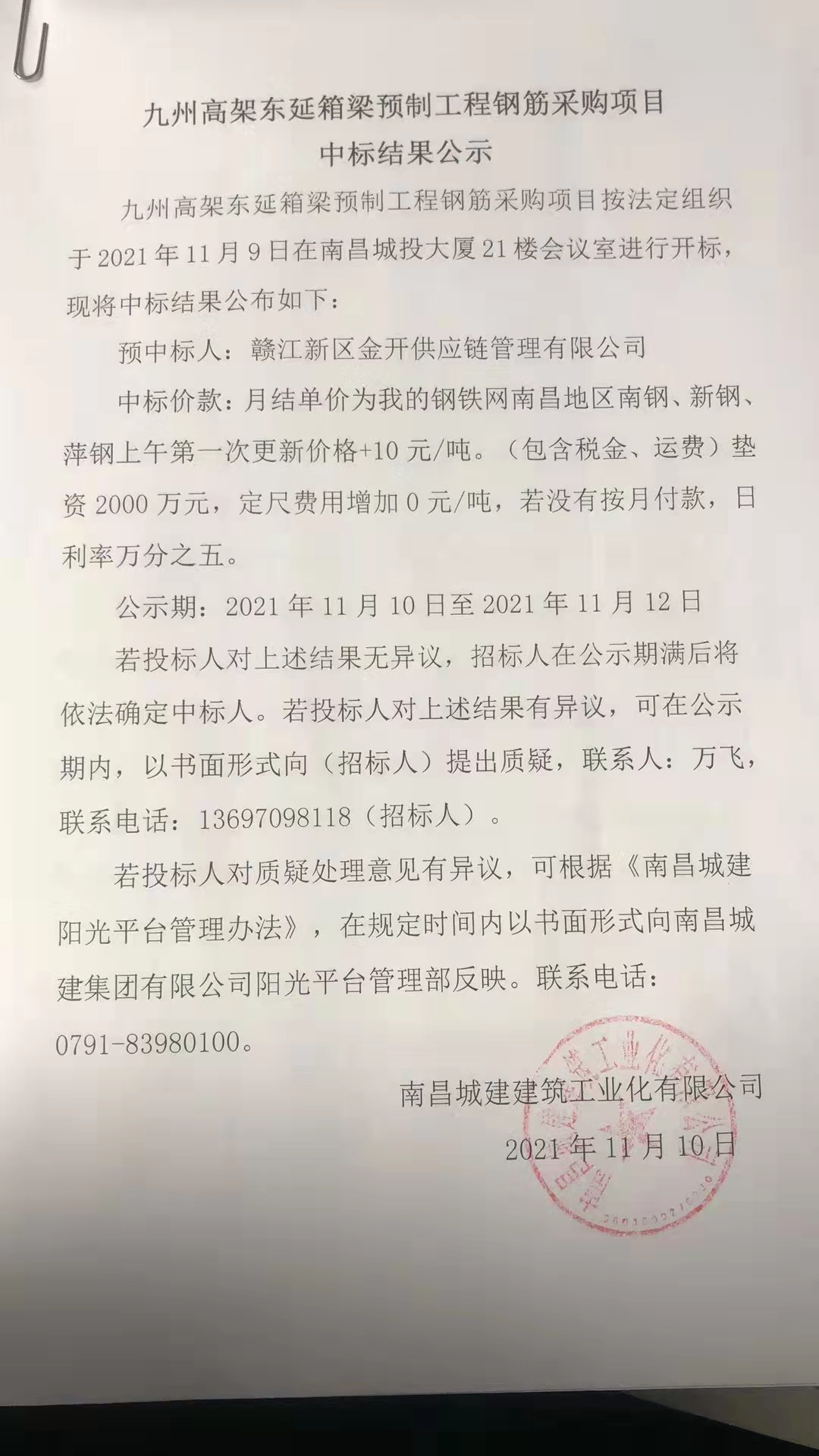 九州高架东延箱梁预制工程钢筋采购项目按法定组织于2021年11月9日在南昌城投大厦21楼会议室进行开标,现将中标结果公布如下: