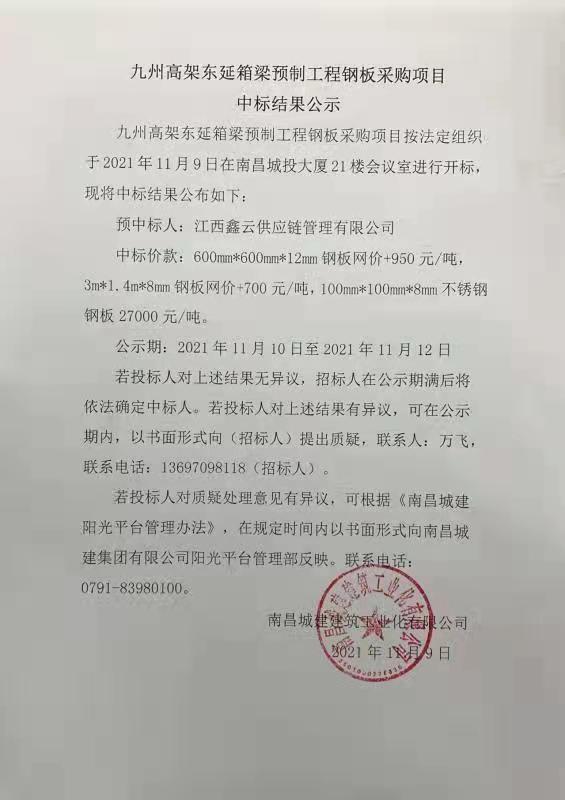 九州高架东延箱梁预制工程钢板采购项目按法定组织于2021年11月9日在南昌城投大厦21楼会议室进行开标,现将中标结果公布如下: