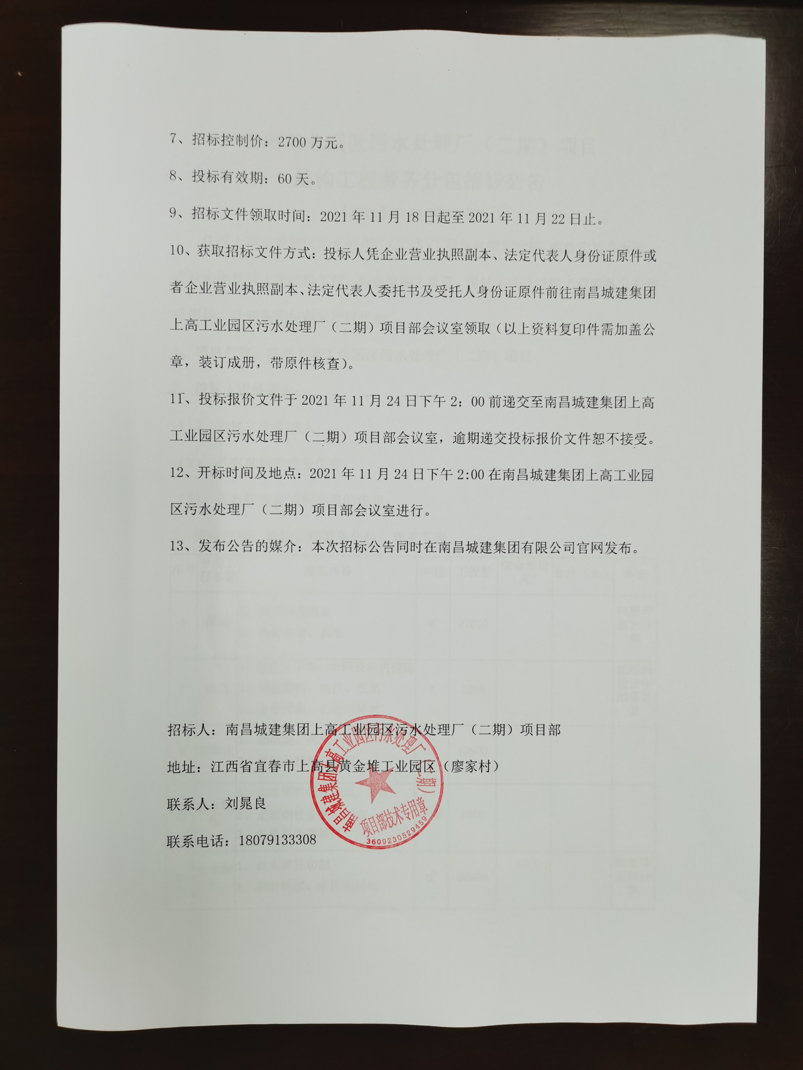 12、开标时间及地点:2021年11月24日下午2:00在必赢亚州242.net集团上高工业园区污水处理厂(二期)项目部会议室进行。