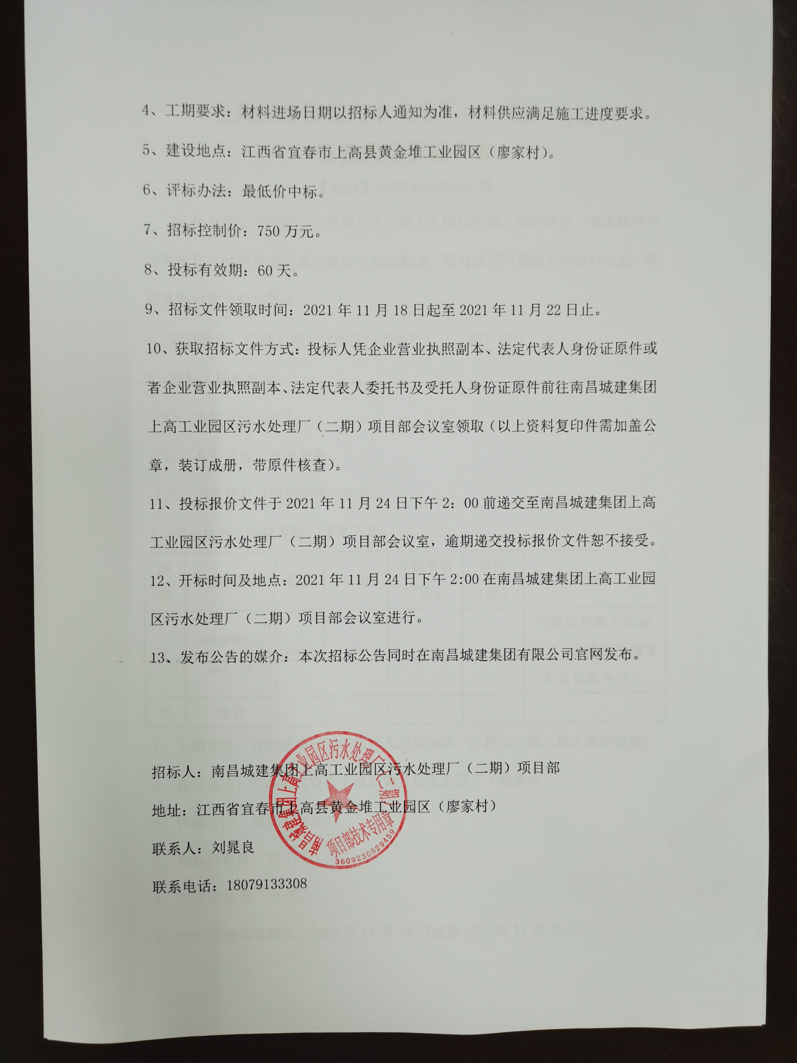11、投标报价文件于2021年11月24日下午2:00前递交至必赢亚州242.net集团上高工业园区污水处理厂(二期)项目部会议室,逾期递交投标报价文件恕不接受。