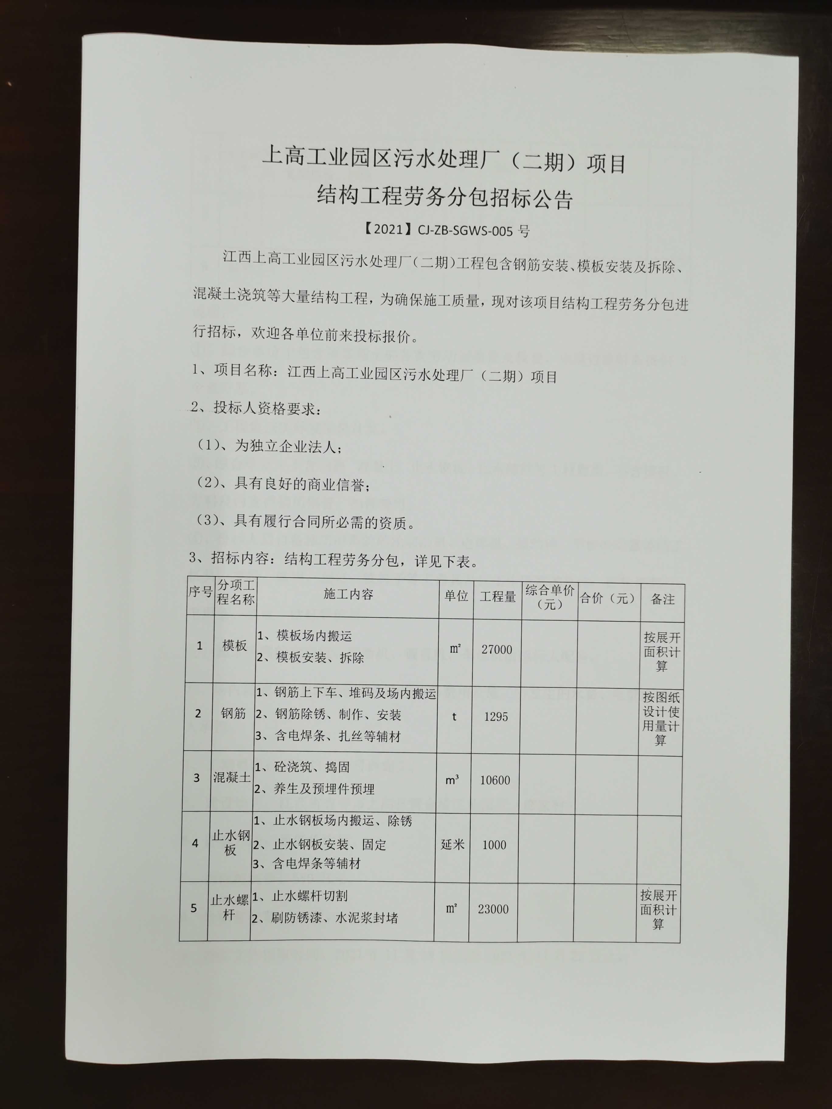 江西上高工业园区污水处理厂(二期)工程包含钢筋安装、模板安装及拆除、混凝土浇筑等大量结构工程,为确保施工质量,现对该项目结构工程劳务分包进行招标,欢迎各单位前来投标报价。