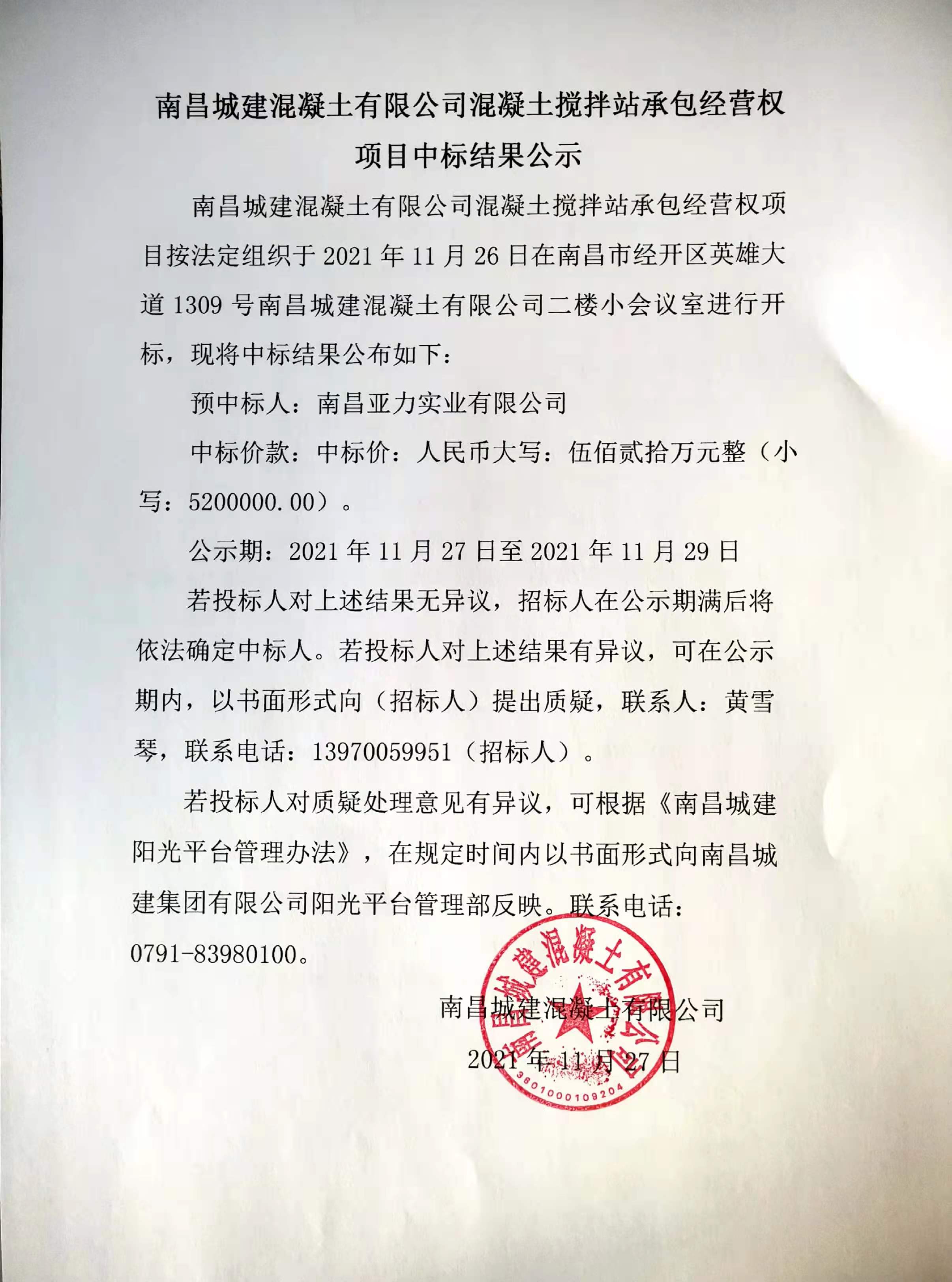 必赢亚州242.net混凝土有限公司混凝土搅拌站承包经营权项目按法定组织于2021年11月26日在南昌市经开区英雄大道1309号必赢亚州242.net混凝土有限公司二楼小会议室进行开标,现将中标结果公布如下: