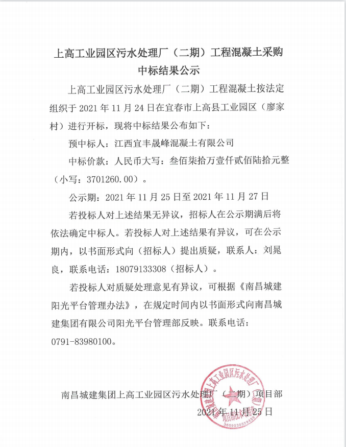 上高工业园区污水处理厂(二期)工程混凝土按法定组织于2021年11月24日在宜春市上高县上高工业园区(廖家村)进行开标,现将中标结果公布如下: