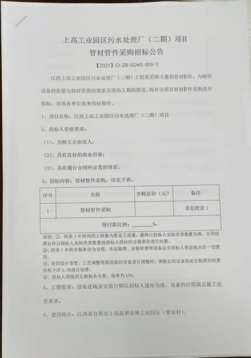 江西上高工业园区污水处理厂(二期)工程需采购大量的管材管件,为确保设备的质量与按时供货的需求及现场工期的推进,现对该项目管材管件采购进行招标,欢迎各单位前来投标报价。