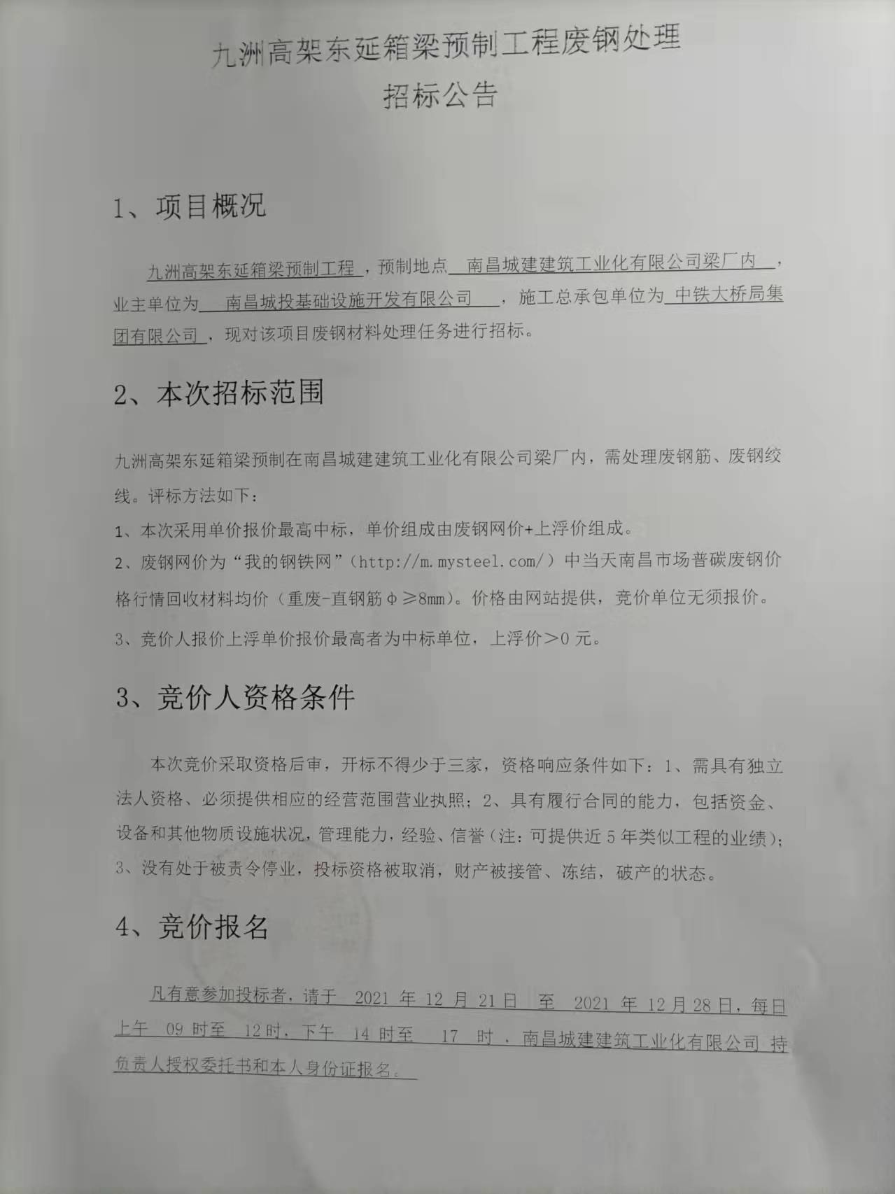 九洲高架东延箱梁预制工程 ,预制地点 必赢亚州242.net建筑工业化有限公司梁厂内 ,业主单位为 南昌城投基础设施开发有限公司 ,施工总承包单位为 中铁大桥局集团有限公司 ,现对该项目废钢材料处理任务进行招标。