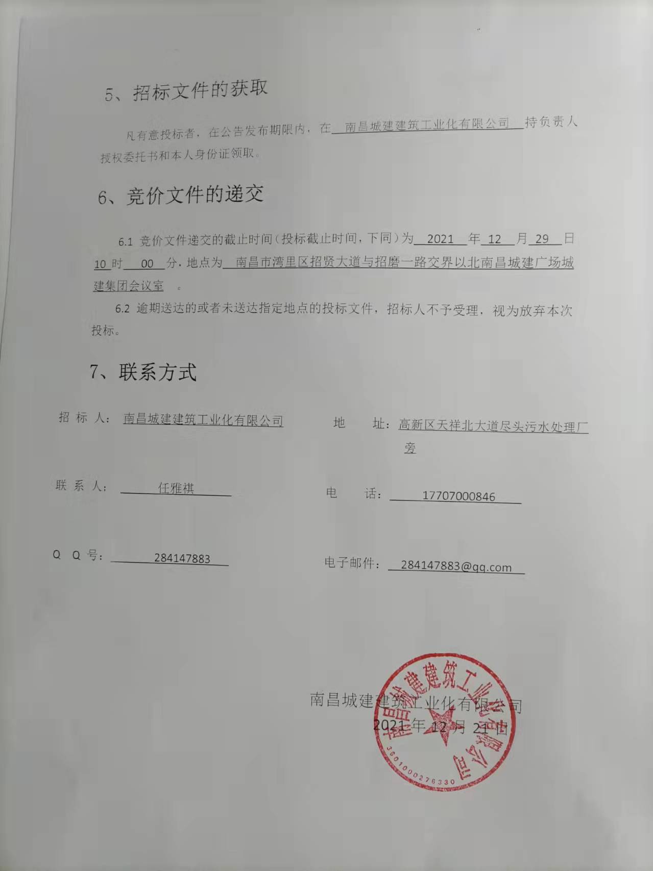 6.1 竞价文件递交的截止时间(投标截止时间,下同)为 2021 年 12 月 29 日10 时 00 分,地点为 南昌市湾里区招贤大道与招磨一路交界以北必赢亚州242.net广场城建集团会议室 。