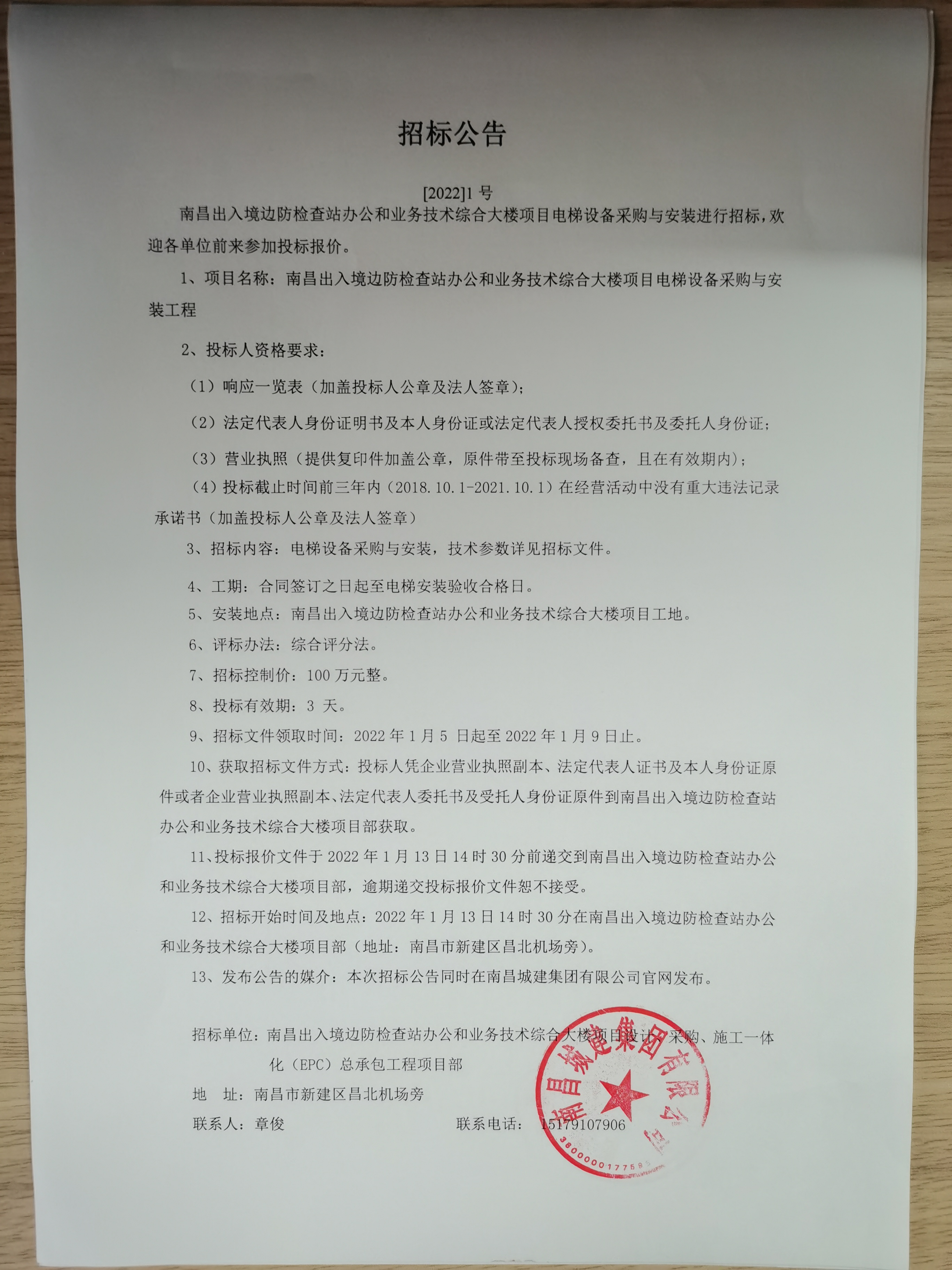 南昌出入境边防检查站办公和业务技术综合大楼项目电梯设备采购与安装进行招标,欢迎各单位前来参加投标报价。