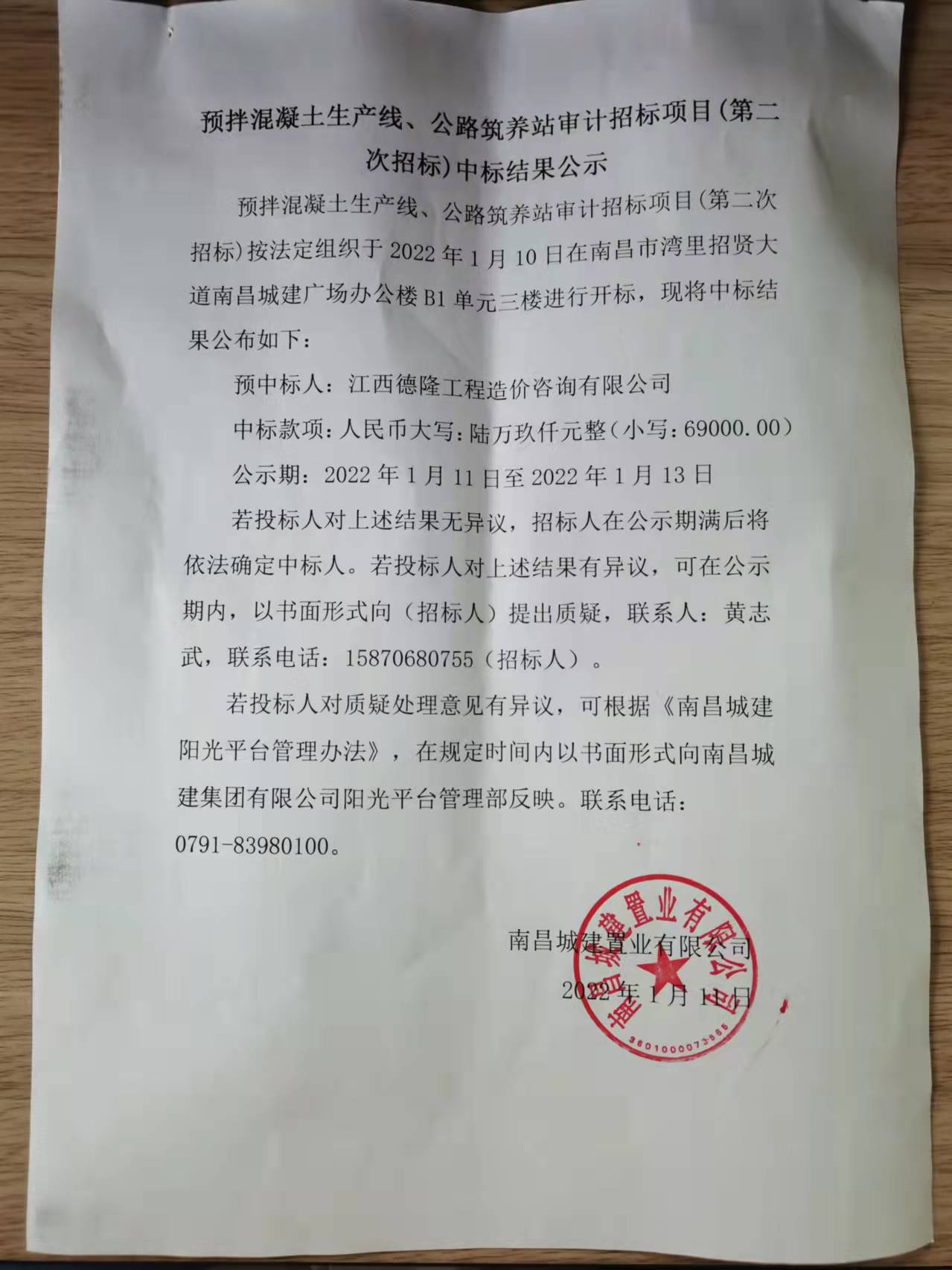 预中标人:江西德隆工程造价咨询有限公司