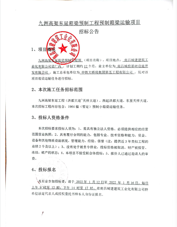 九洲高架东延箱梁预制工程预 (项目名称),项目地点: 必赢亚州242.net建筑工业化有限公司梁厂内 ,计划工期约12个月,业主单位为 南昌城投基础设施开发有限公司 ,施工总承包单位为 中铁大桥局集团第五工程有限公司 ,现对该项目箱梁运输任务进行招标。
