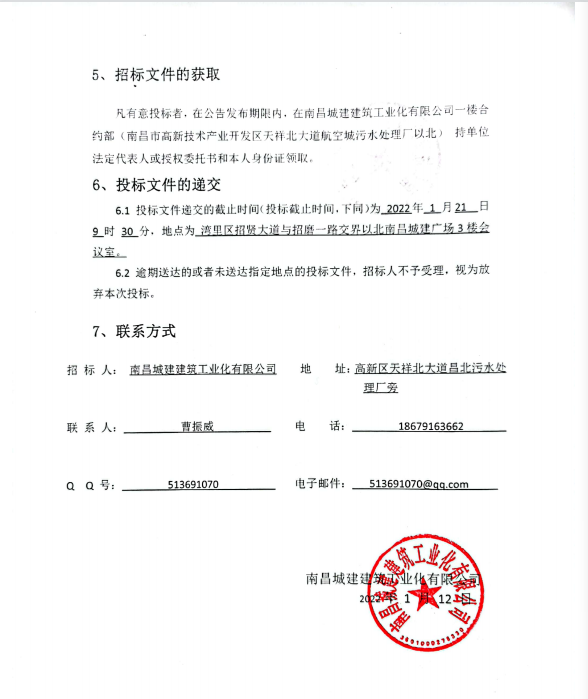 招 标 人: 必赢亚州242.net建筑工业化有限公司 地 址:高新区天祥北大道昌北污水处理厂旁