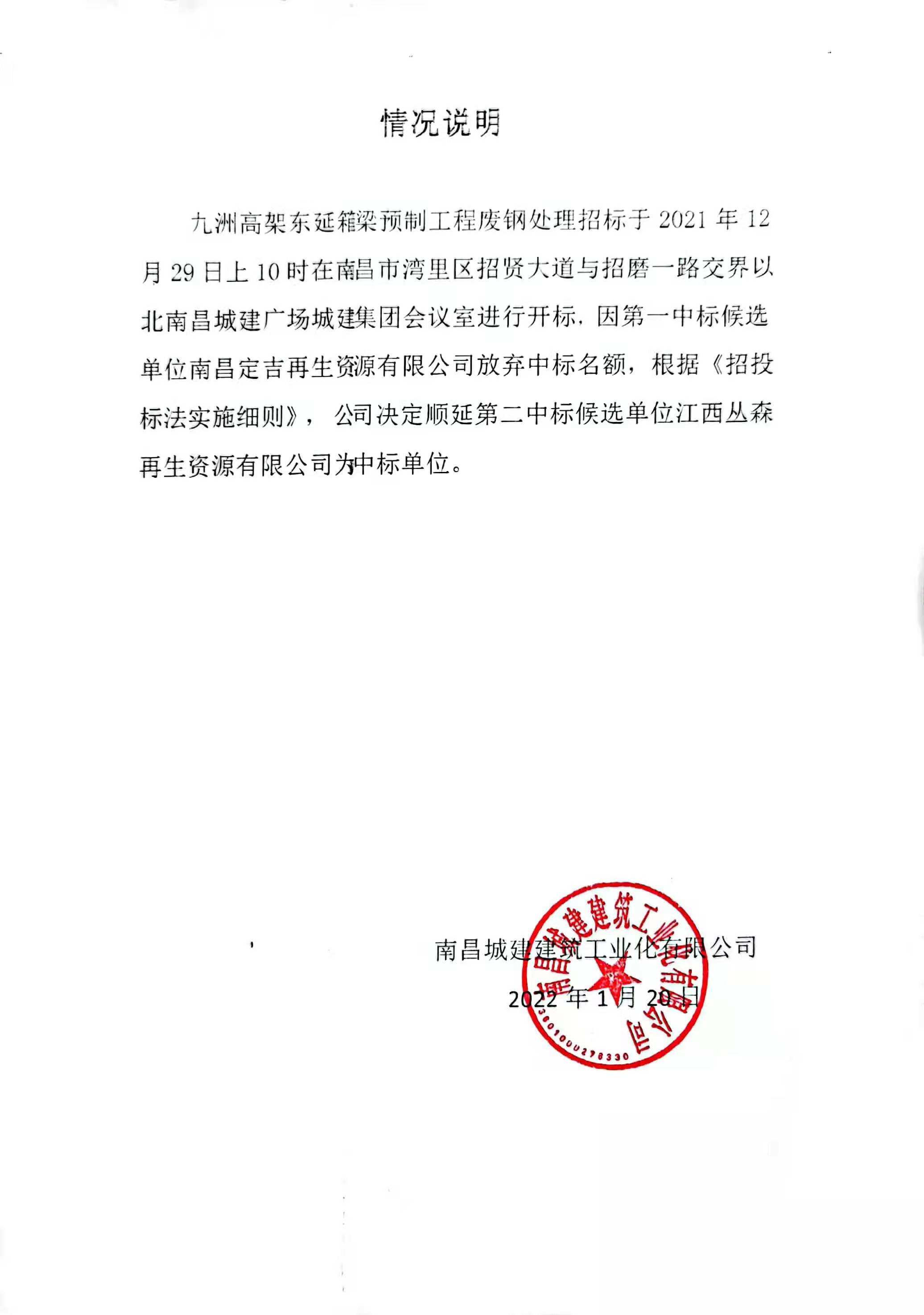 九洲高架东延箱梁预制工程废钢处理招标于2021年12月29日上午10时在南昌市湾里区招贤大道与招磨一路交界以北必赢亚州242.net广场城建集团会议室进行开标,因第一中标候选单位南昌定吉再生资源有限公司放弃中标名额,根据《招投标法实施细则》, 公司决定顺延第二中标候选单位江西丛森再生资源有限公司为中标单位。