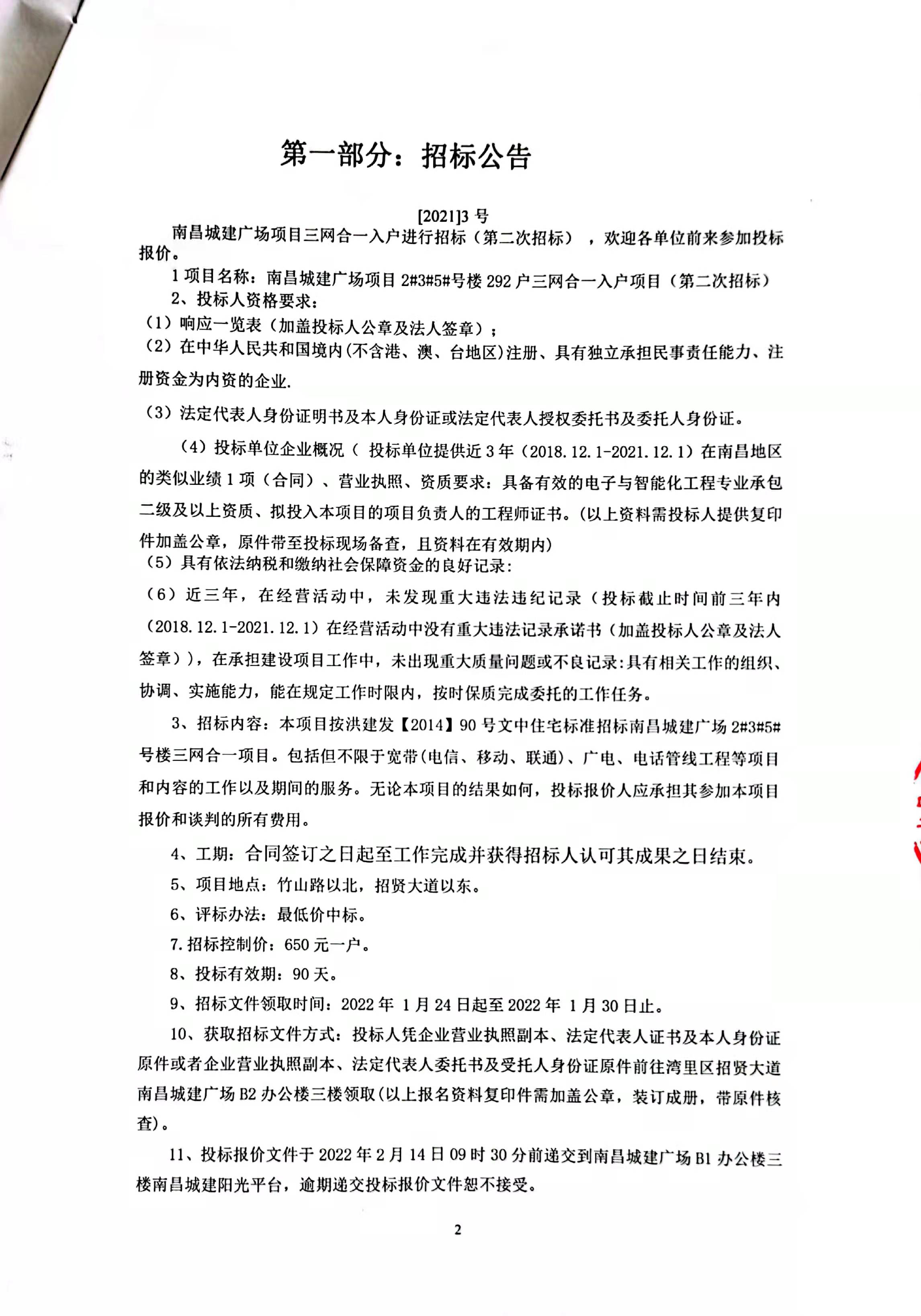 3、招标内容:本项目按洪建发【2014】90号文中住宅标准招标必赢亚州242.net广场2#3#5#号楼三网合一项目。包括但不限于宽带(电信、移动、联通)、广电、电话管线工程等项目和内容的工作以及期间的服务。无论本项目的结果如何,投标报价人应承担其参加本项目报价和谈判的所有费用。