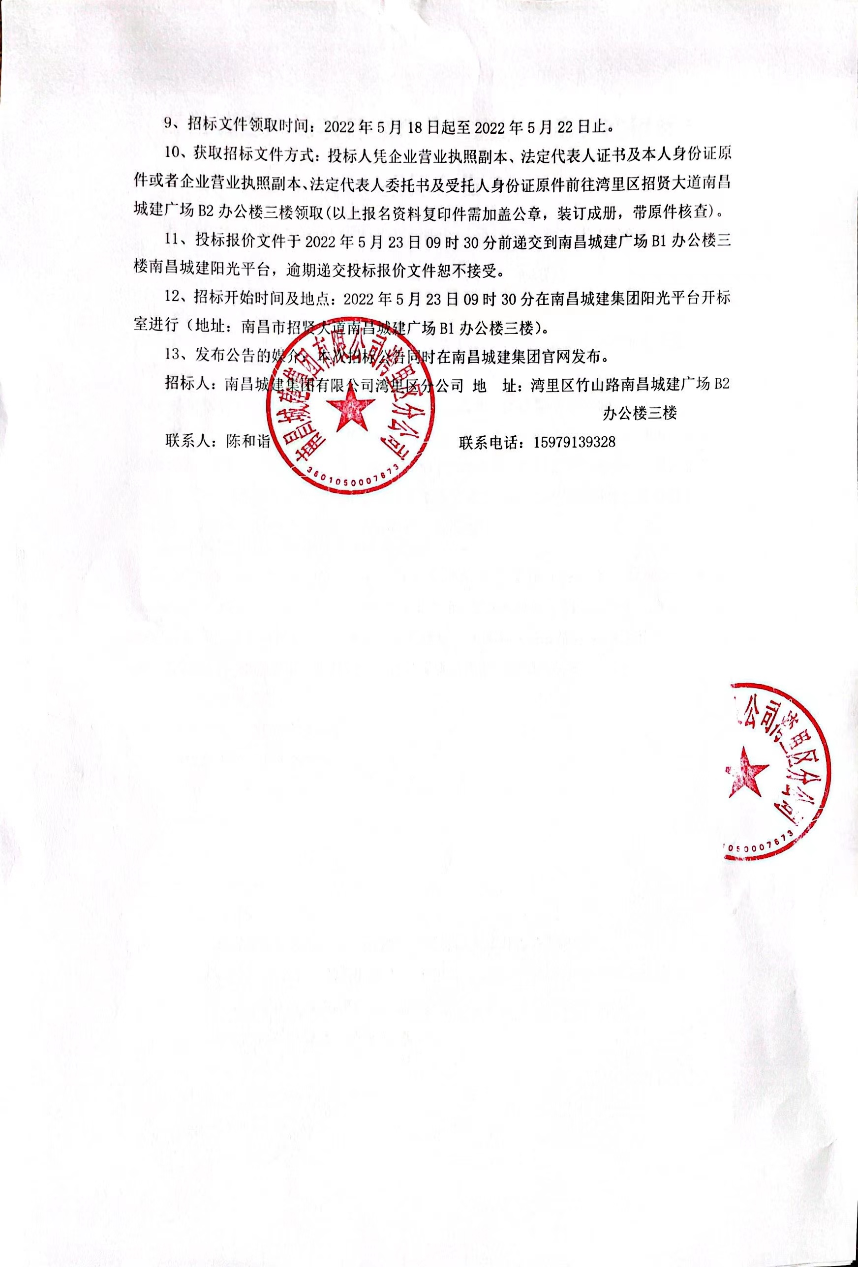 12、招标开始时间及地点:2022年5月23日09时30分在必赢亚州242.net集团阳光平台开标室进行(地址:南昌市招贤大道必赢亚州242.net广场B1办公楼三楼)。