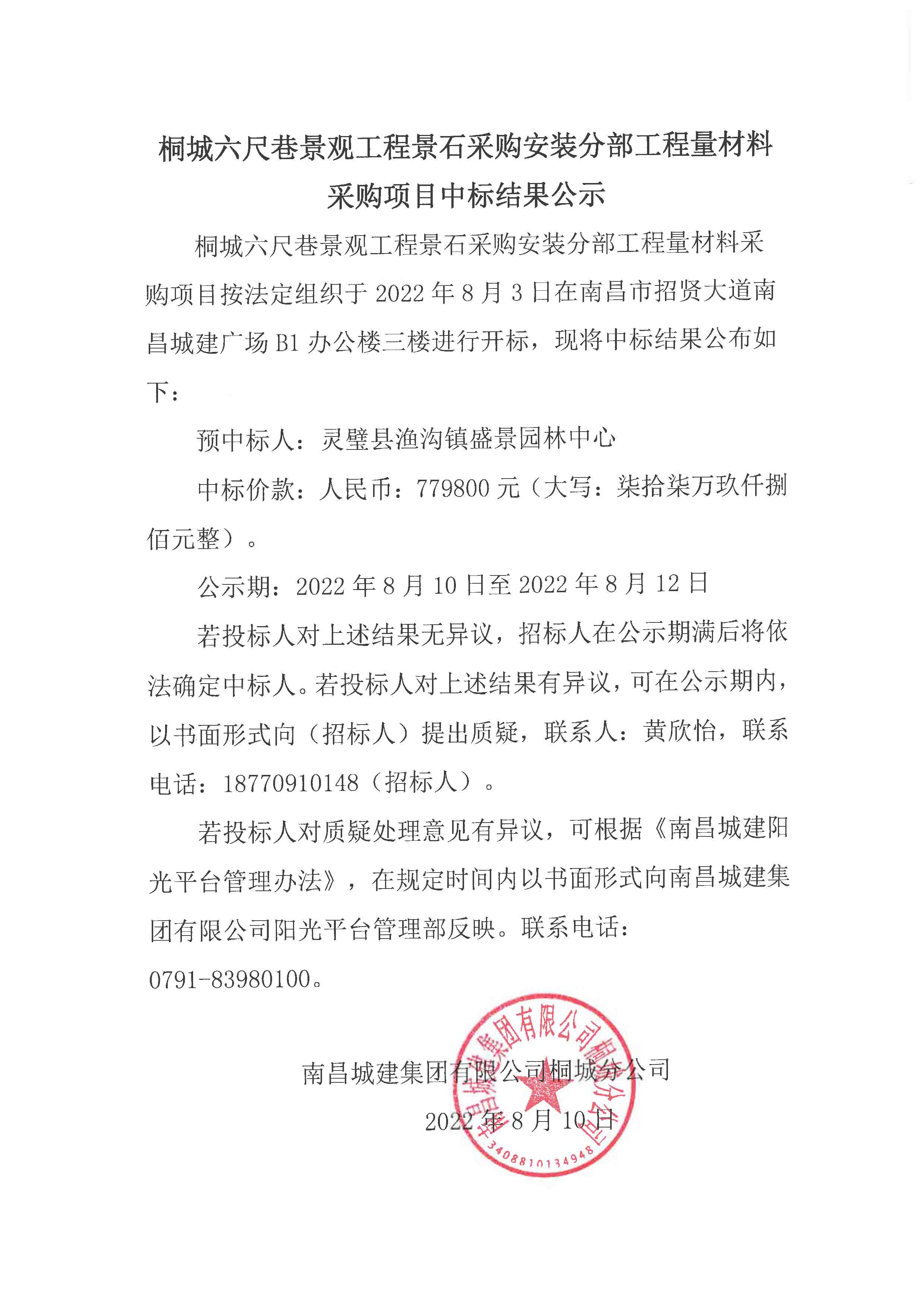 桐城六尺巷景观工程景石采购安装分部工程量材料采购项目按法定组织于2022年8月3日在南昌市招贤大道必赢亚州242.net广场B1办公楼三楼进行开标,现将中标结果公布如下: