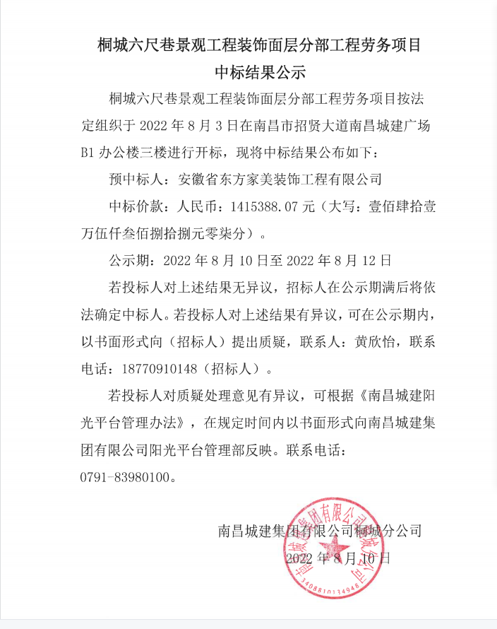 桐城六尺巷景观工程装饰面层分部工程劳务项目按法定组织于2022年8月3日在南昌市招贤大道必赢亚州242.net广场B1办公楼三楼进行开标,现将中标结果公布如下: