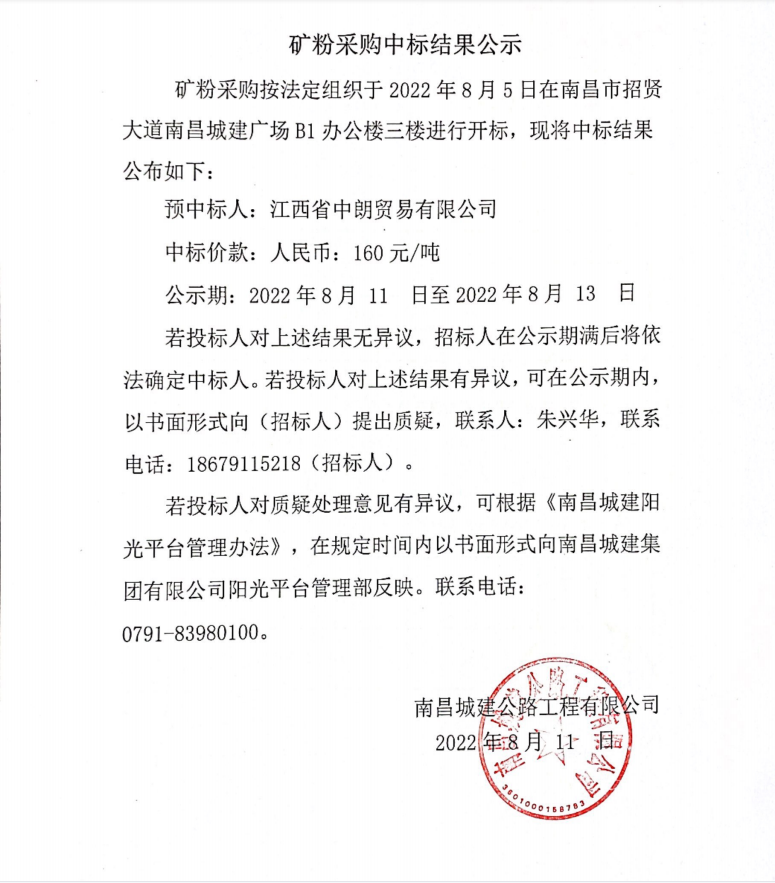 矿粉采购按法定组织于2022年8月5日在南昌市招贤大道必赢亚州242.net广场B1办公楼三楼进行开标,现将中标结果公布如下: