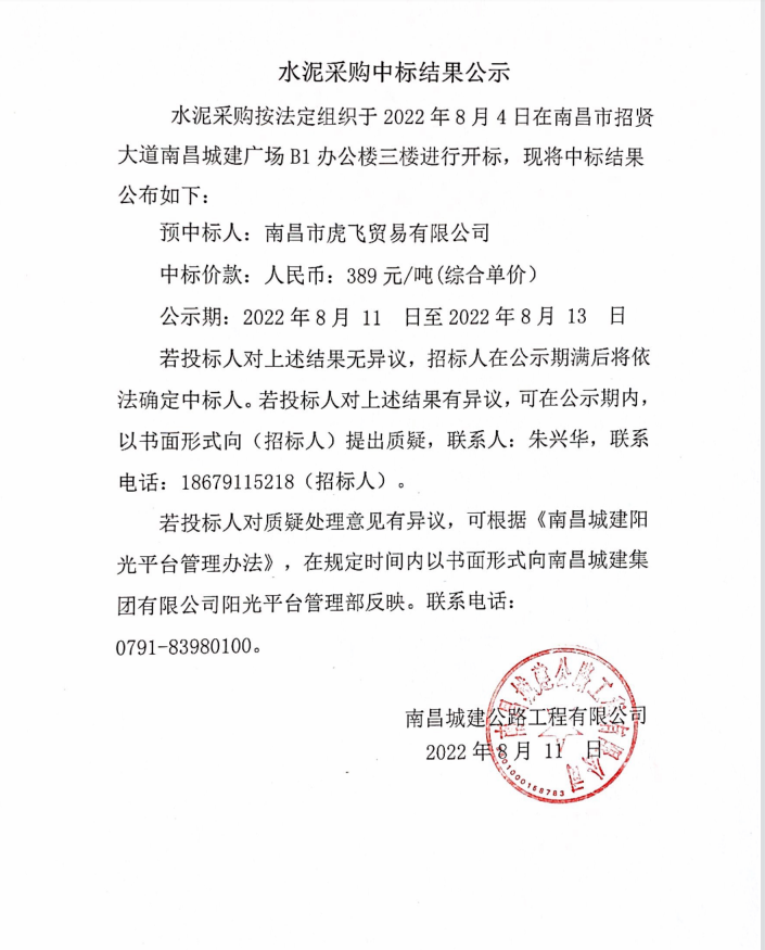 水泥采购按法定组织于2022年8月4日在南昌市招贤大道必赢亚州242.net广场B1办公楼三楼进行开标,现将中标结果公布如下: