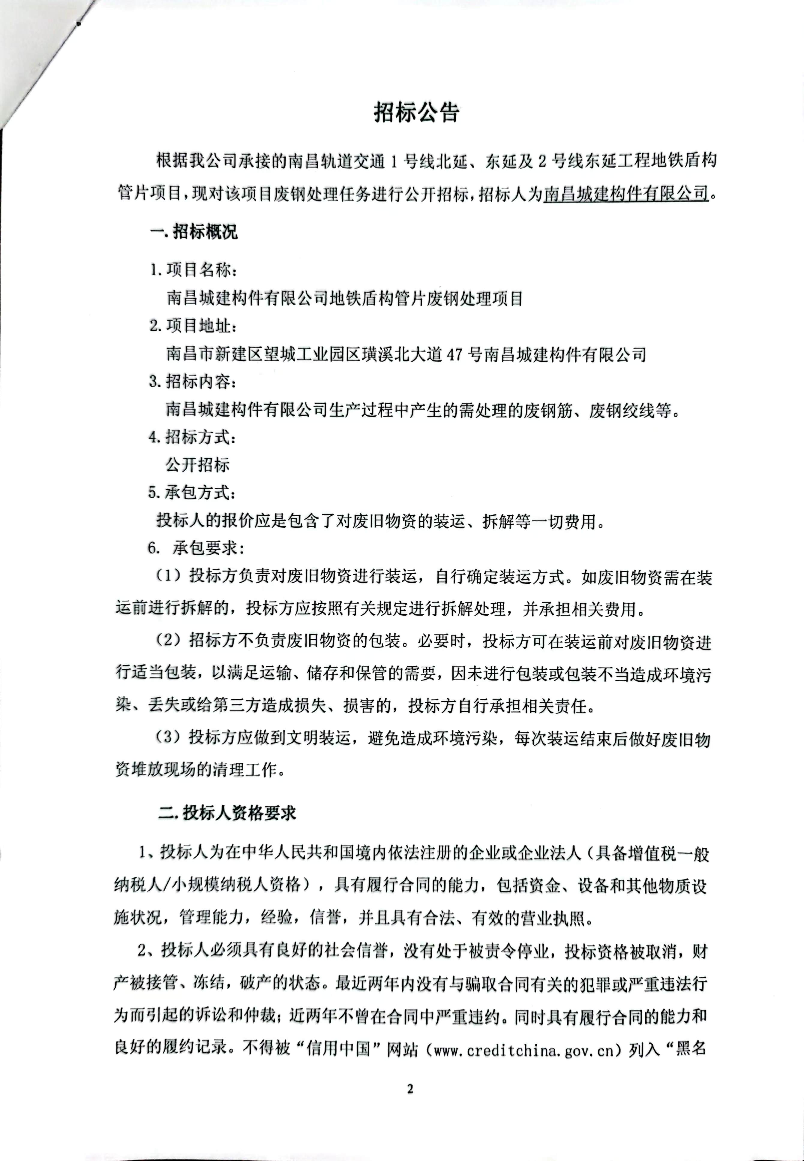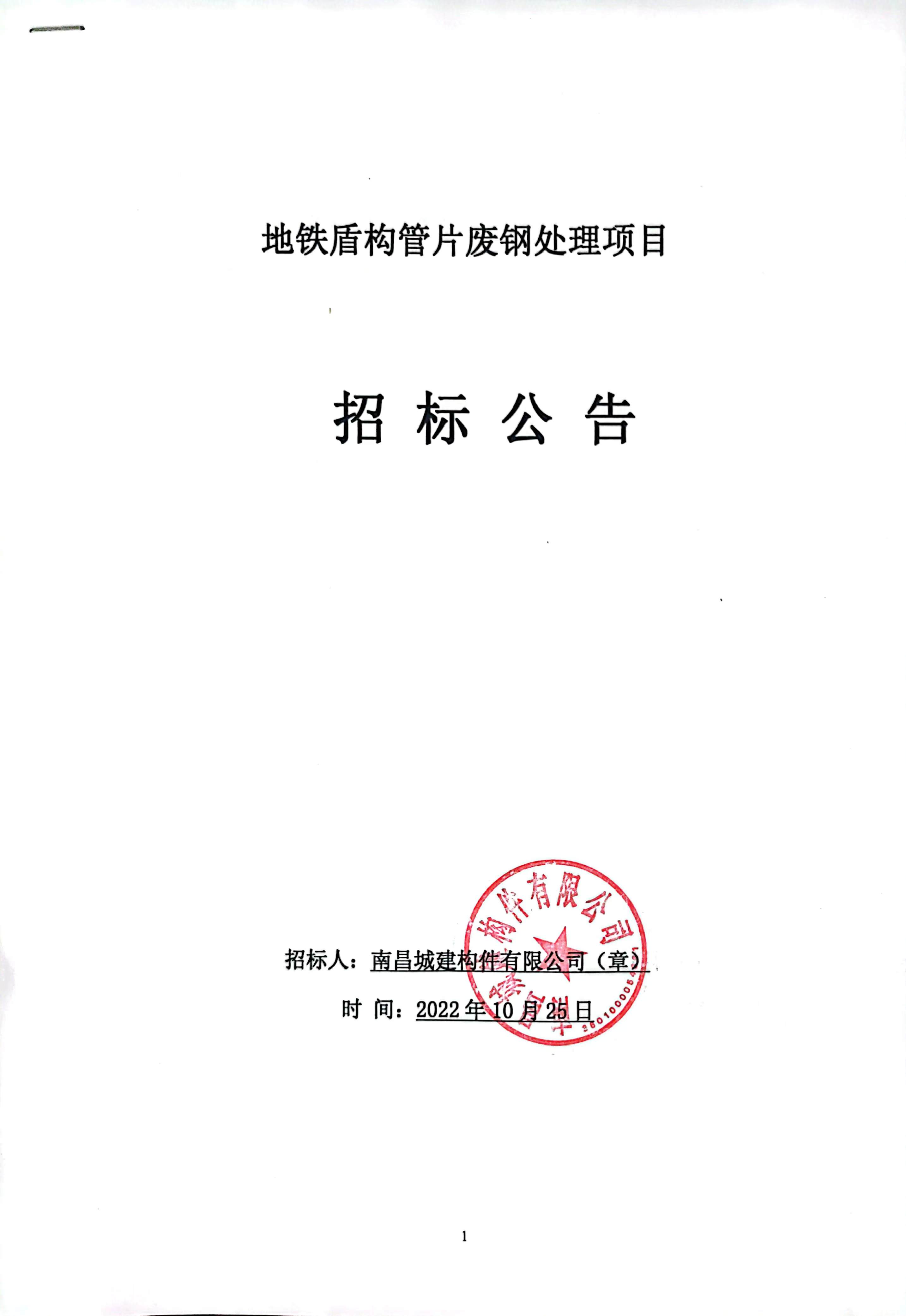 根据我公司承接的南昌轨道交通1号线北延、东延及2号线东延工程地铁盾构管片项目,现对该项目废钢处理任务进行公开招标,招标人为必赢亚州242.net构件有限公司。