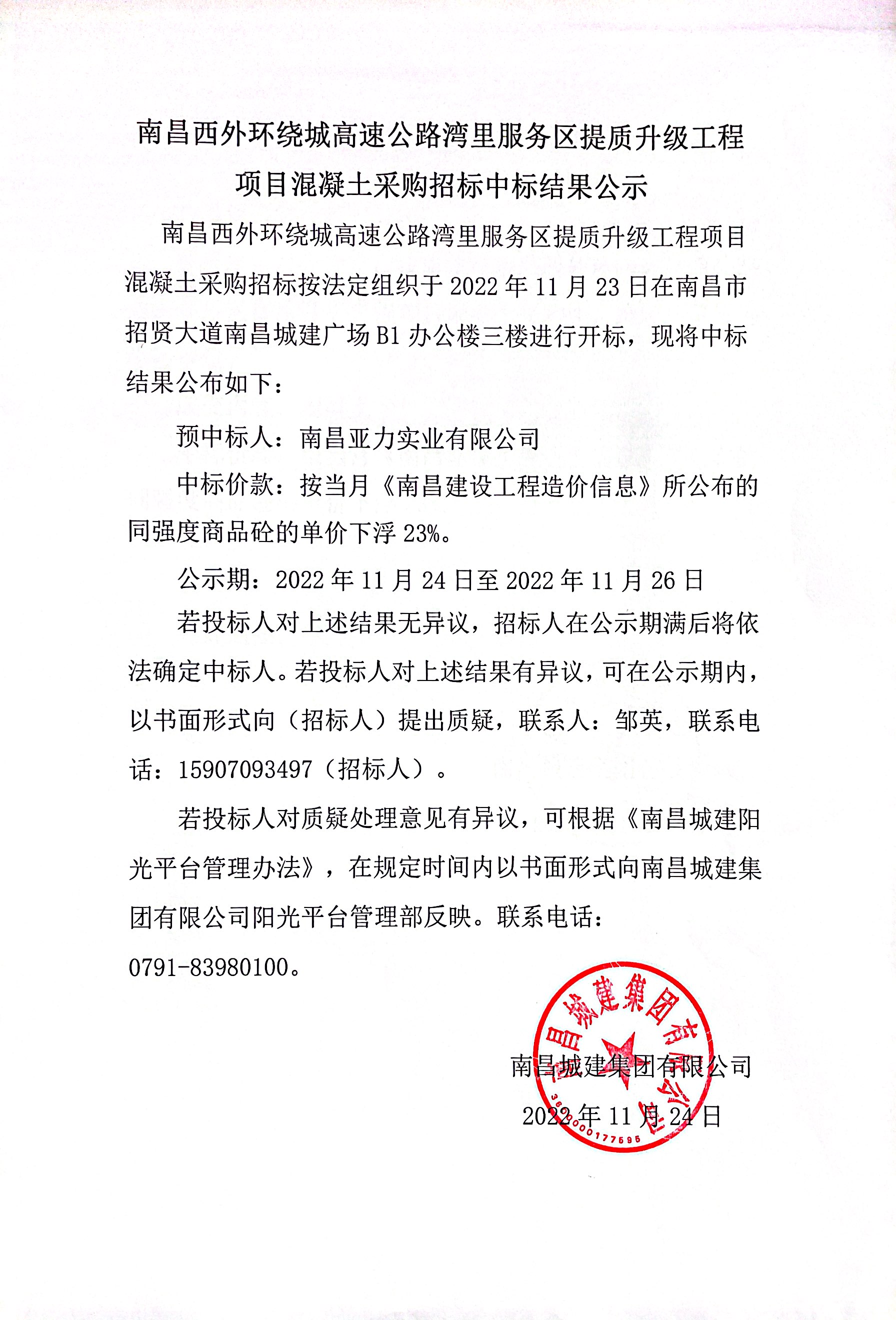 南昌西外环绕城高速公路湾里服务区提质升级工程项目混凝土采购招标按法定组织于2022年11月23日在南昌市招贤大道必赢亚州242.net广场B1办公楼三楼进行开标,现将中标结果公布如下: