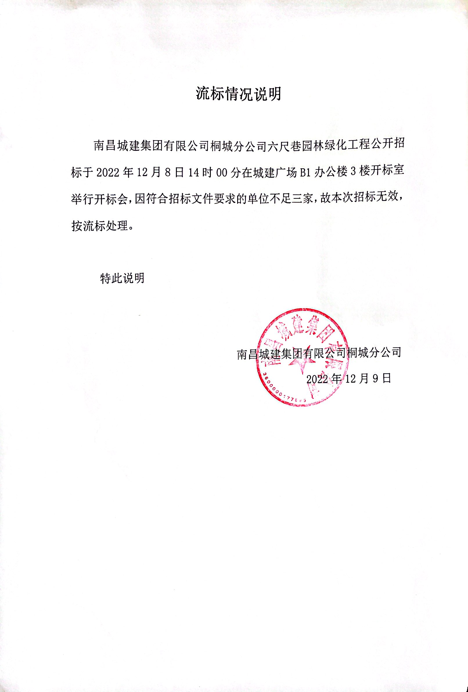 必赢亚州242.net集团有限公司桐城分公司六尺巷园林绿化工程公开招标于2022年12月8日14时00分在城建广场B1办公楼3楼开标室举行开标会,因符合招标文件要求的单位不足三家,故本次招标无效,按流标处理。