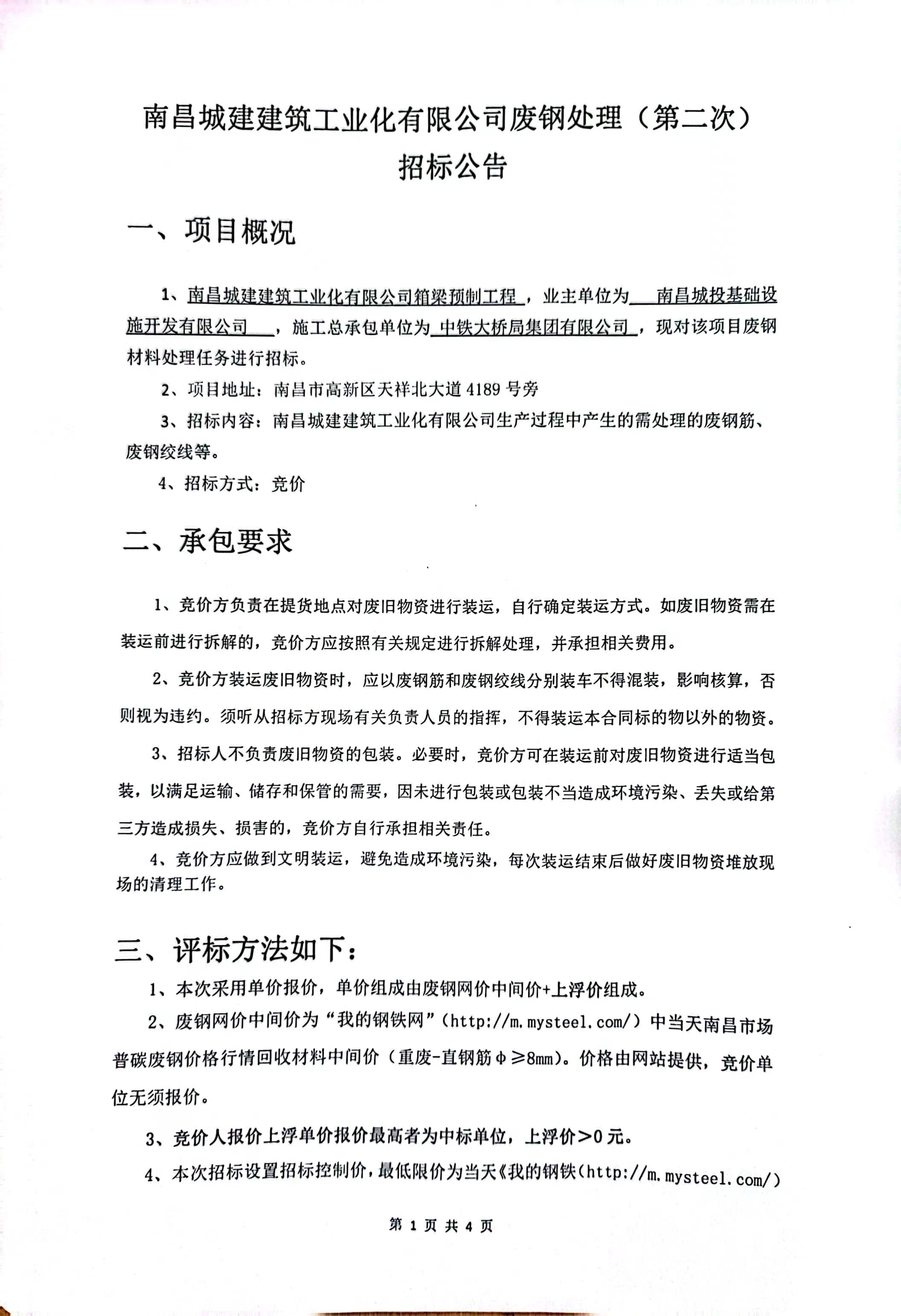 1、必赢亚州242.net建筑工业化有限公司箱梁预制工程 ,业主单位为 南昌城投基础设施开发有限公司 ,施工总承包单位为 中铁大桥局集团有限公司 ,现对该项目废钢材料处理任务进行招标。