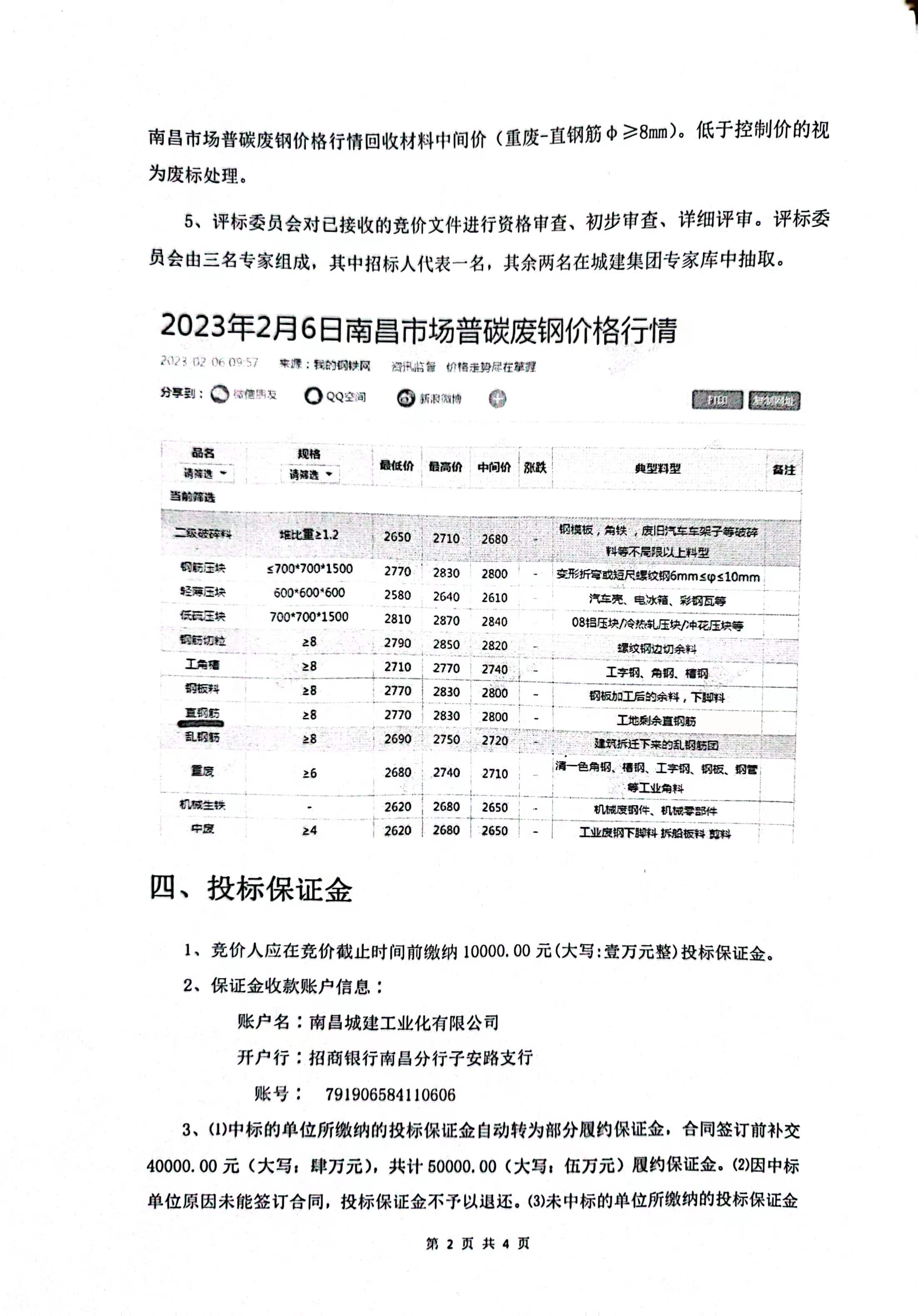2、废钢网价中间价为“我的钢铁网”(http://m.mysteel.com/)中当天南昌市场普碳废钢价格行情回收材料中间价(重废-直钢筋φ≥8mm)。价格由网站提供,竞价单位无须报价。