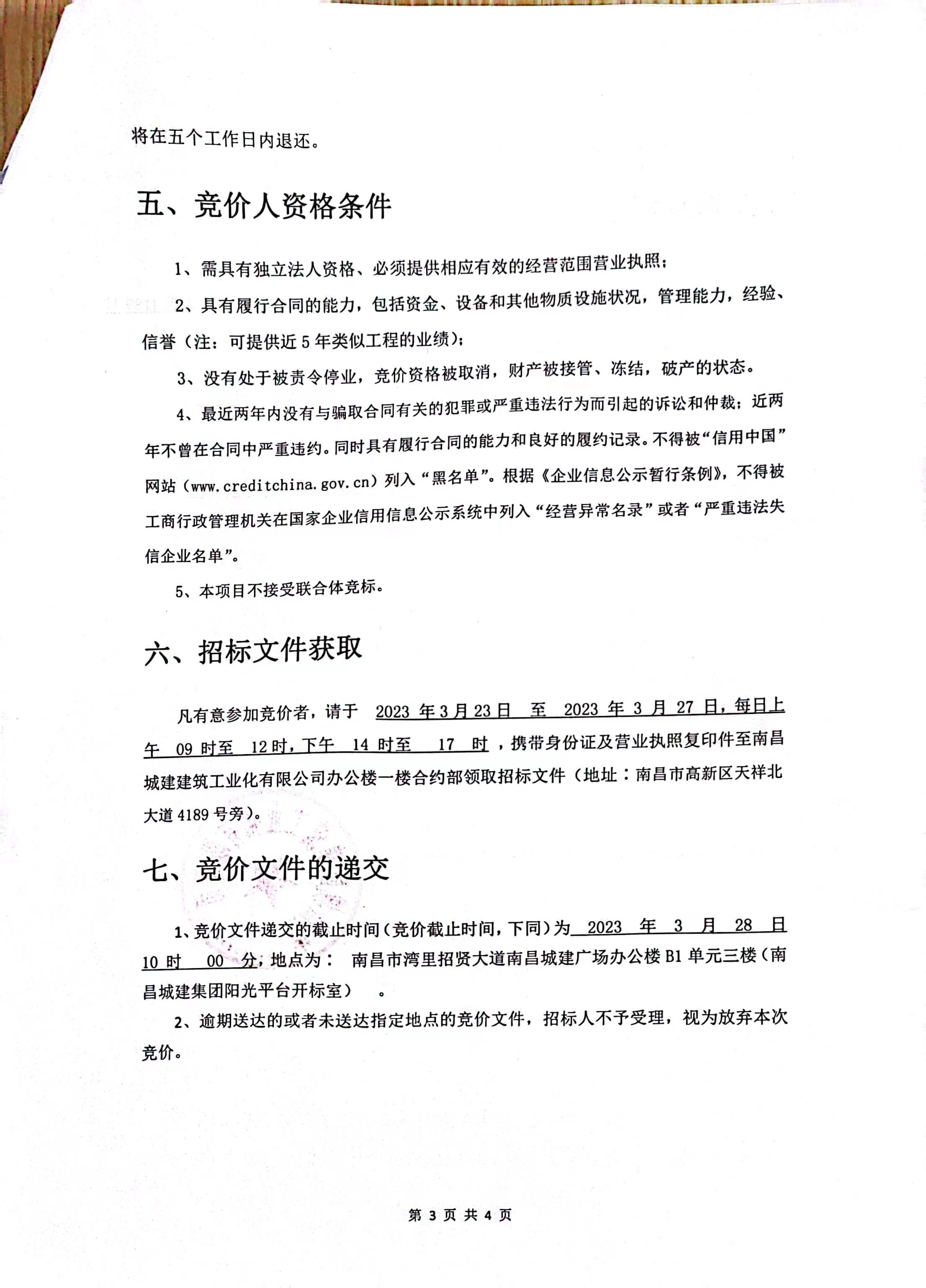 凡有意参加竞价者,请于 2023 年3月23日 至 2023 年 3 月 27 日,每日上午 09 时至 12时,下午 14 时至 17 时 ,携带身份证及营业执照复印件至必赢亚州242.net建筑工业化有限公司办公楼一楼合约部领取招标文件(地址∶南昌市高新区天祥北大道4189号旁)。