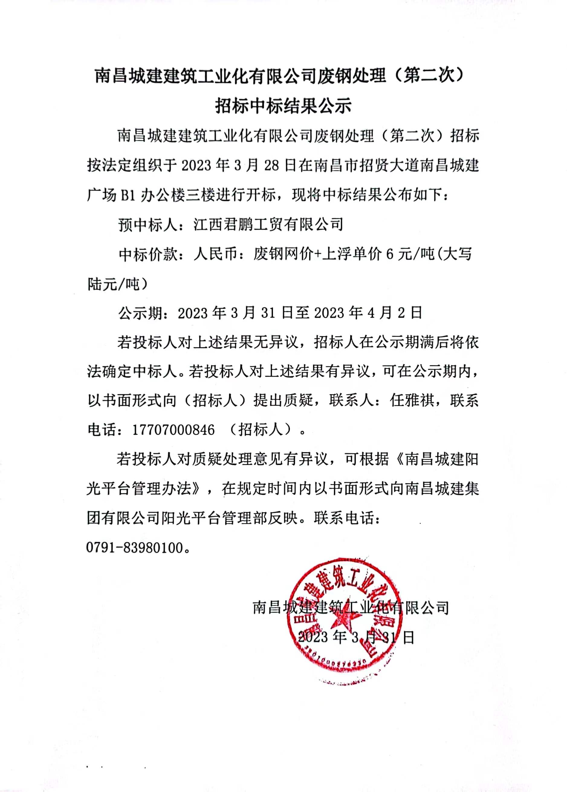 必赢亚州242.net建筑工业化有限公司废钢处理(第二次)招标按法定组织于2023年3月28日在南昌市招贤大道必赢亚州242.net广场B1办公楼三楼进行开标,现将中标结果公布如下: