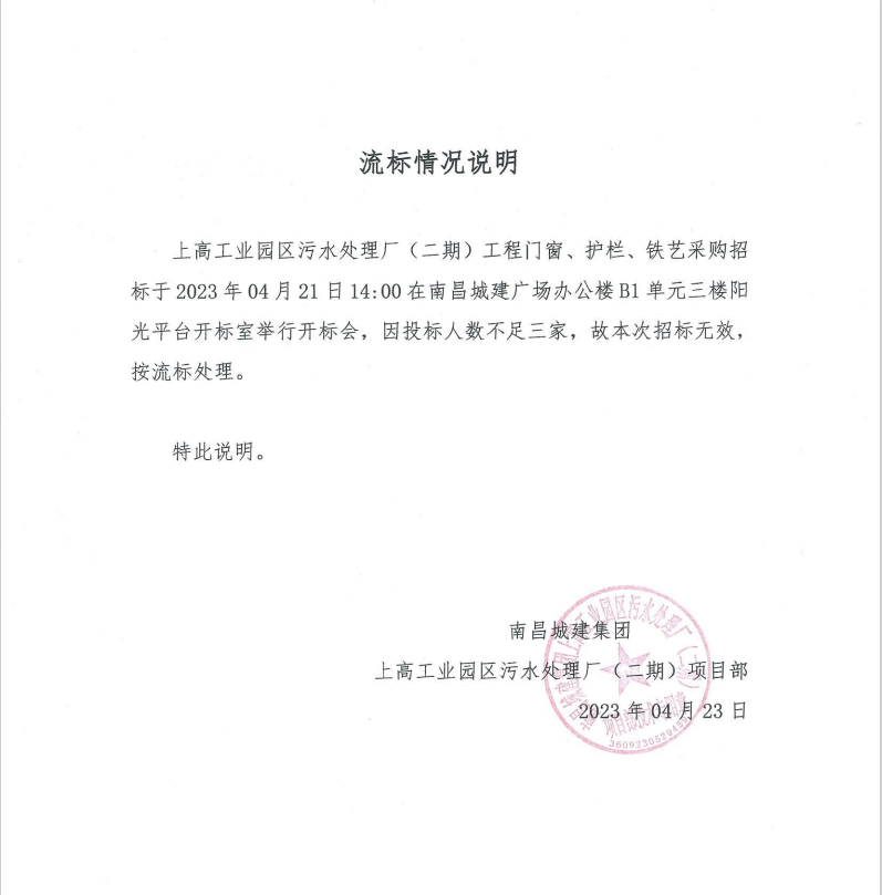 上高工业园区污水处理厂(二期)工程门窗、护栏、铁艺采购招标于2023年04月21日14:00在必赢亚州242.net广场办公楼B1单元三楼阳光平台开标室举行开标会,因投标人数不足三家,故本次招标无效,按流标处理。