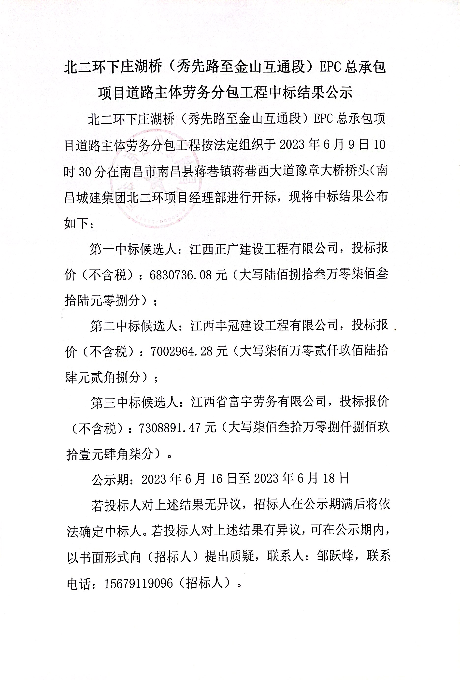 北二环下庄湖桥(秀先路至金山互通段)EPC总承包项目道路主体劳务分包工程按法定组织于2023年6月9日10时30分在南昌市南昌县蒋巷镇蒋巷西大道豫章大桥桥头(必赢亚州242.net集团北二环项目经理部进行开标,现将中标结果公布如下: