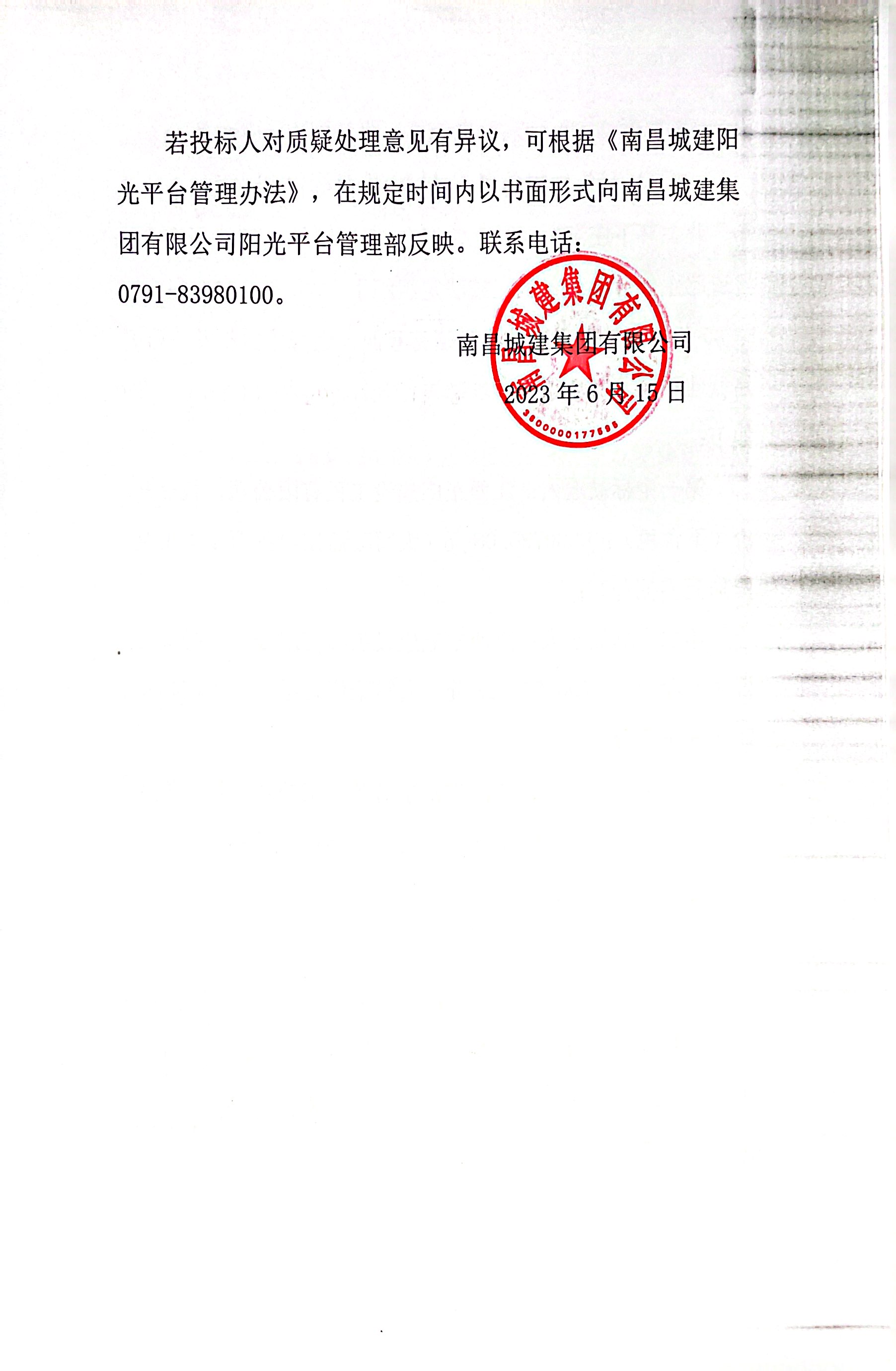 若投标人对质疑处理意见有异议,可根据《必赢亚州242.net阳光平台管理办法》,在规定时间内以书面形式向必赢亚州242.net集团有限公司阳光平台管理部反映。联系电话:0791-83980100。
