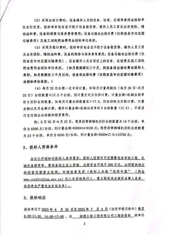 (3)采用月租计费时,投标单价包含且不限于设备租赁费、操作人员工资及法定保险、辅助油料费、设备的维修与保养费等费用;设备运输进出场运费(仅限南昌市内范围运输费用)、设备操作人员在项目上的饮食、住宿费及施工消耗燃油费用由招标单位承担。(如月租期超过三个月,则设备进出场运费由投标人承担,如月租期在三个月以内,设备进出场运费(仅限南昌市内范围运输费用)由招标单位承担。)