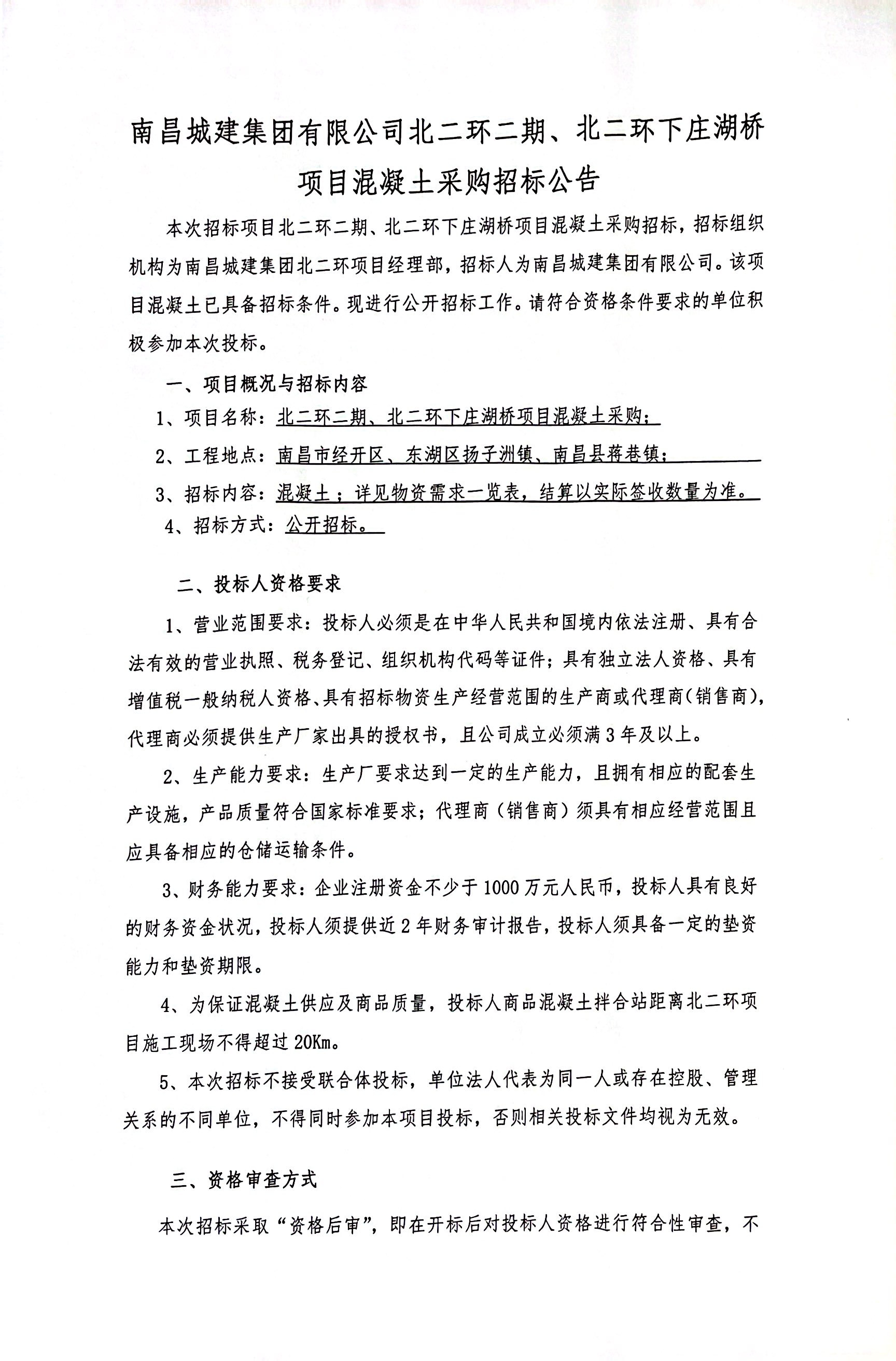 本次招标项目北二环二期、北二环下庄湖桥项目混凝土采购招标,招标组织机构为必赢亚州242.net集团北二环项目经理部,招标人为必赢亚州242.net集团有限公司。该项目混凝土已具备招标条件。现进行公开招标工作。请符合资格条件要求的单位积极参加本次投标。