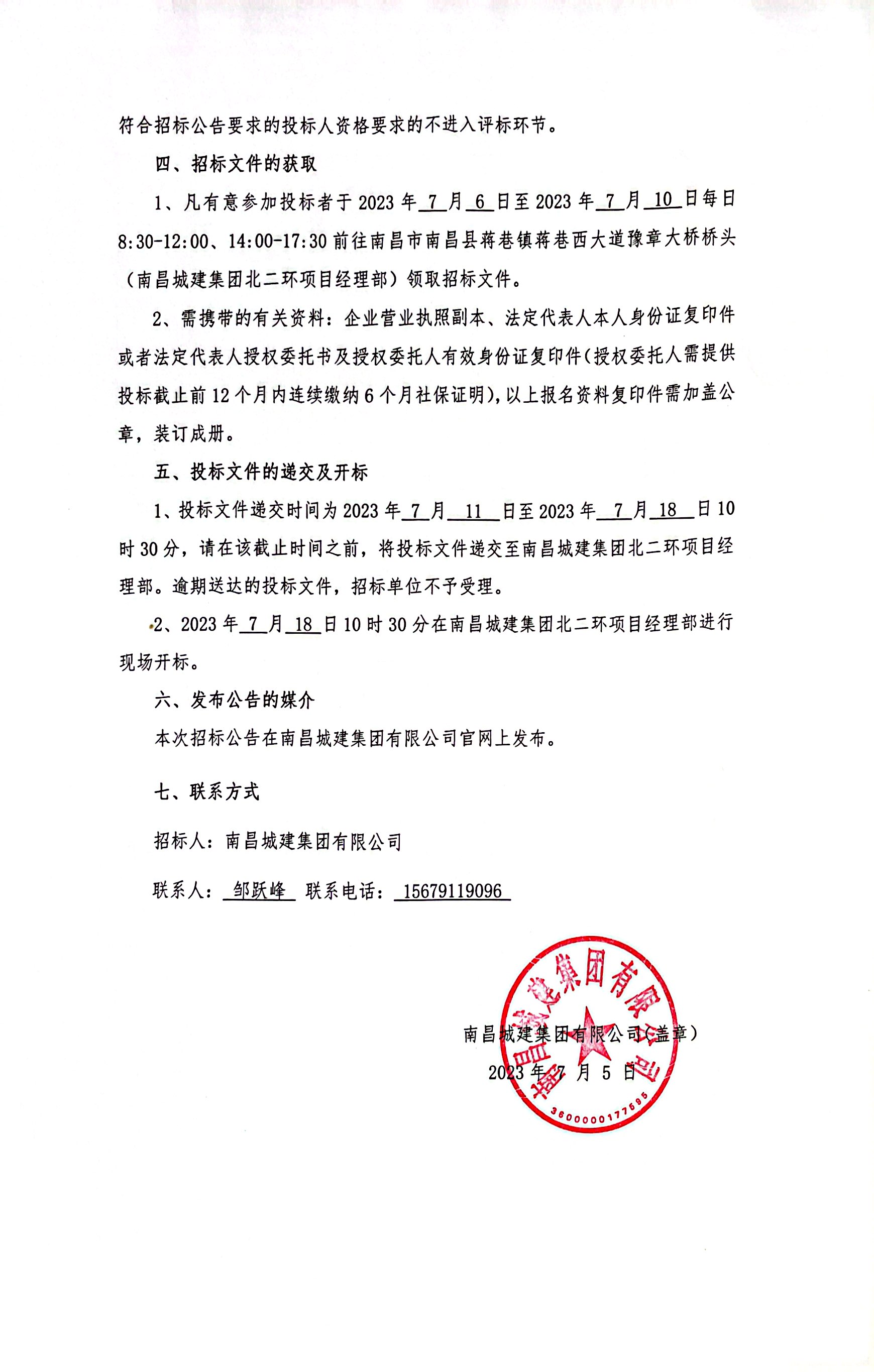 1、凡有意参加投标者于2023年 7 月 6 日至2023年 7 月 10 日每日8:30-12:00、14:00-17:30前往南昌市南昌县蒋巷镇蒋巷西大道豫章大桥桥头(必赢亚州242.net集团北二环项目经理部)领取招标文件。