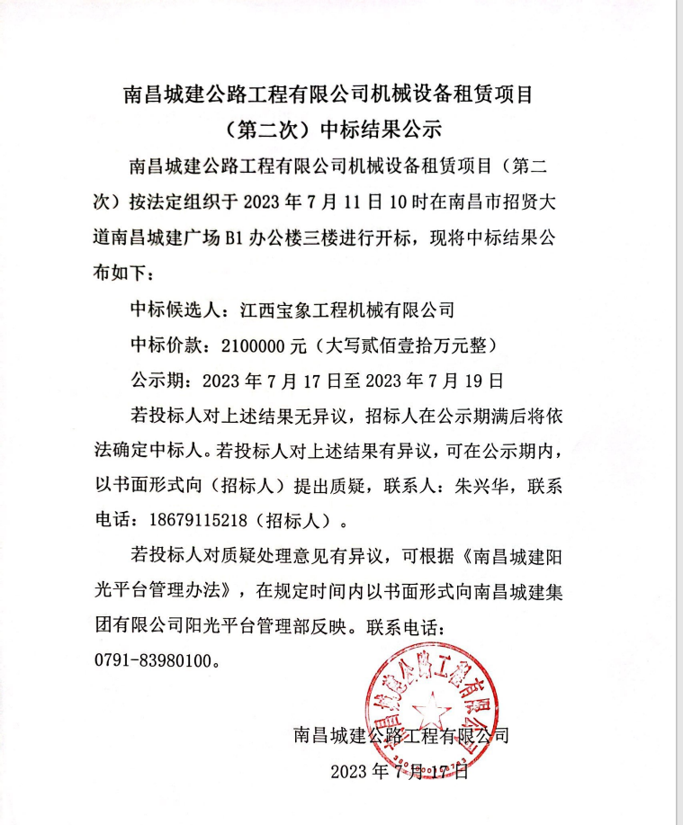 必赢亚州242.net公路工程有限公司机械设备租赁项目(第二次)按法定组织于2023年7月11日10时在南昌市招贤大道必赢亚州242.net广场B1办公楼三楼进行开标,现将中标结果公布如下: