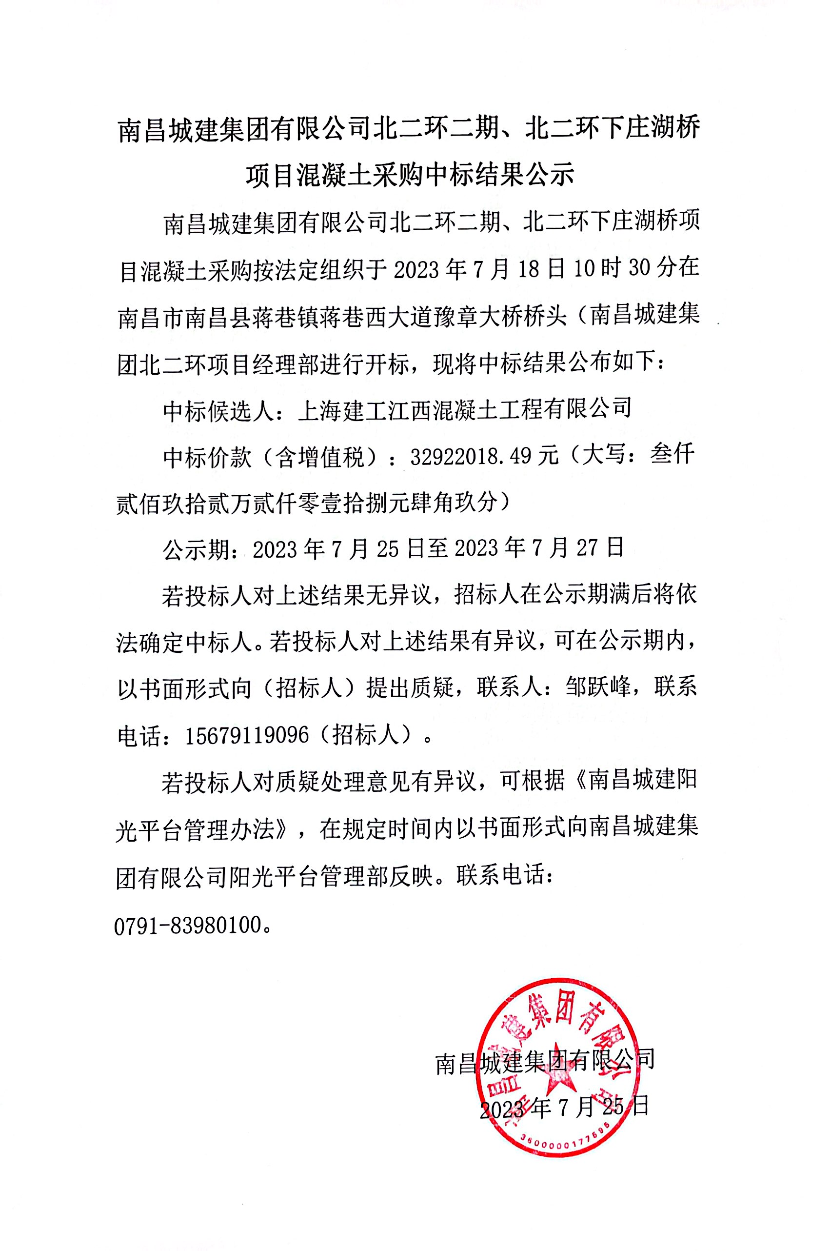 必赢亚州242.net集团有限公司北二环二期、北二环下庄湖桥项目混凝土采购按法定组织于2023年7月18日10时30分在南昌市南昌县蒋巷镇蒋巷西大道豫章大桥桥头(必赢亚州242.net集团北二环项目经理部进行开标,现将中标结果公布如下: