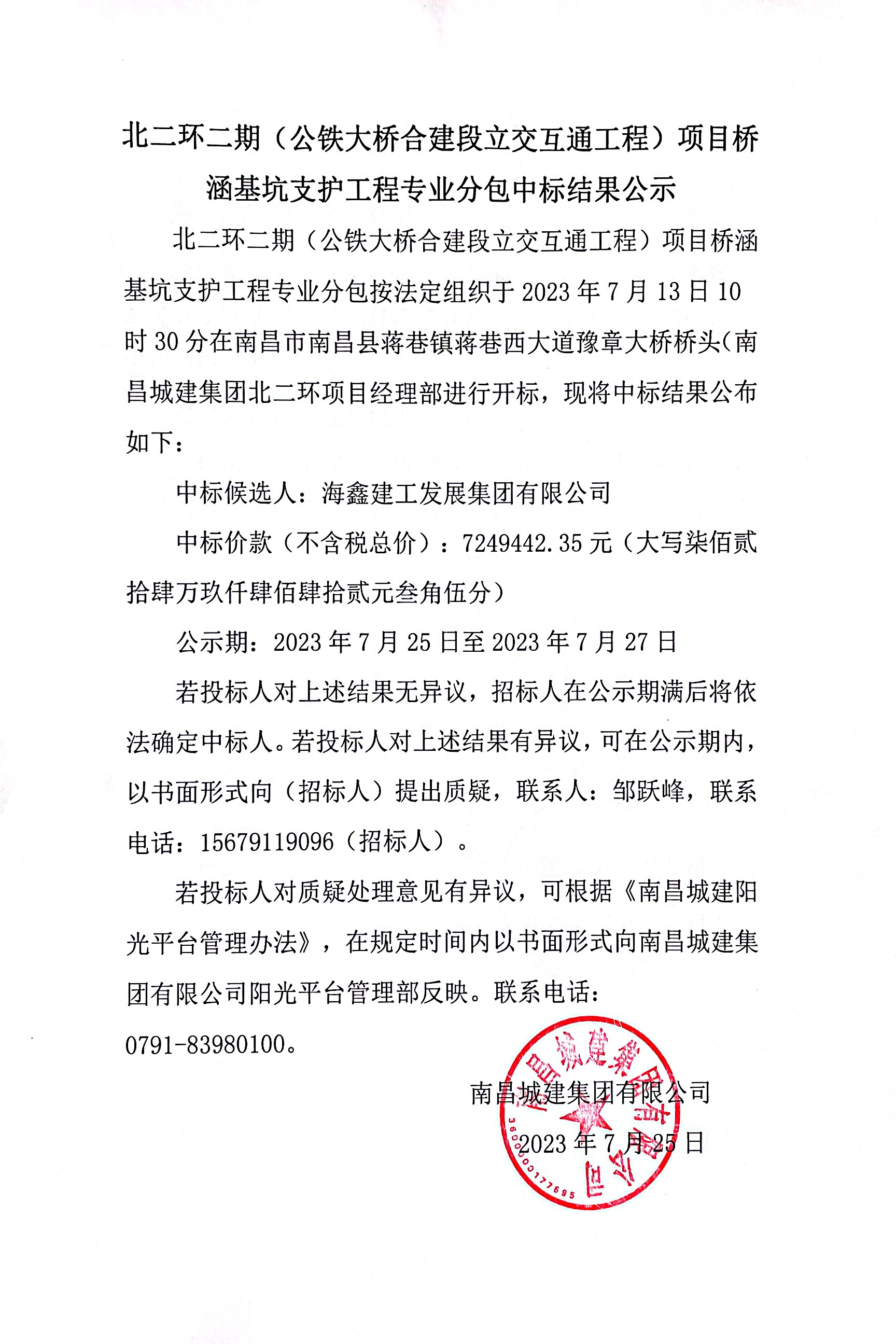 北二环二期(公铁大桥合建段立交互通工程)项目桥涵基坑支护工程专业分包按法定组织于2023年7月13日10时30分在南昌市南昌县蒋巷镇蒋巷西大道豫章大桥桥头(必赢亚州242.net集团北二环项目经理部进行开标,现将中标结果公布如下: