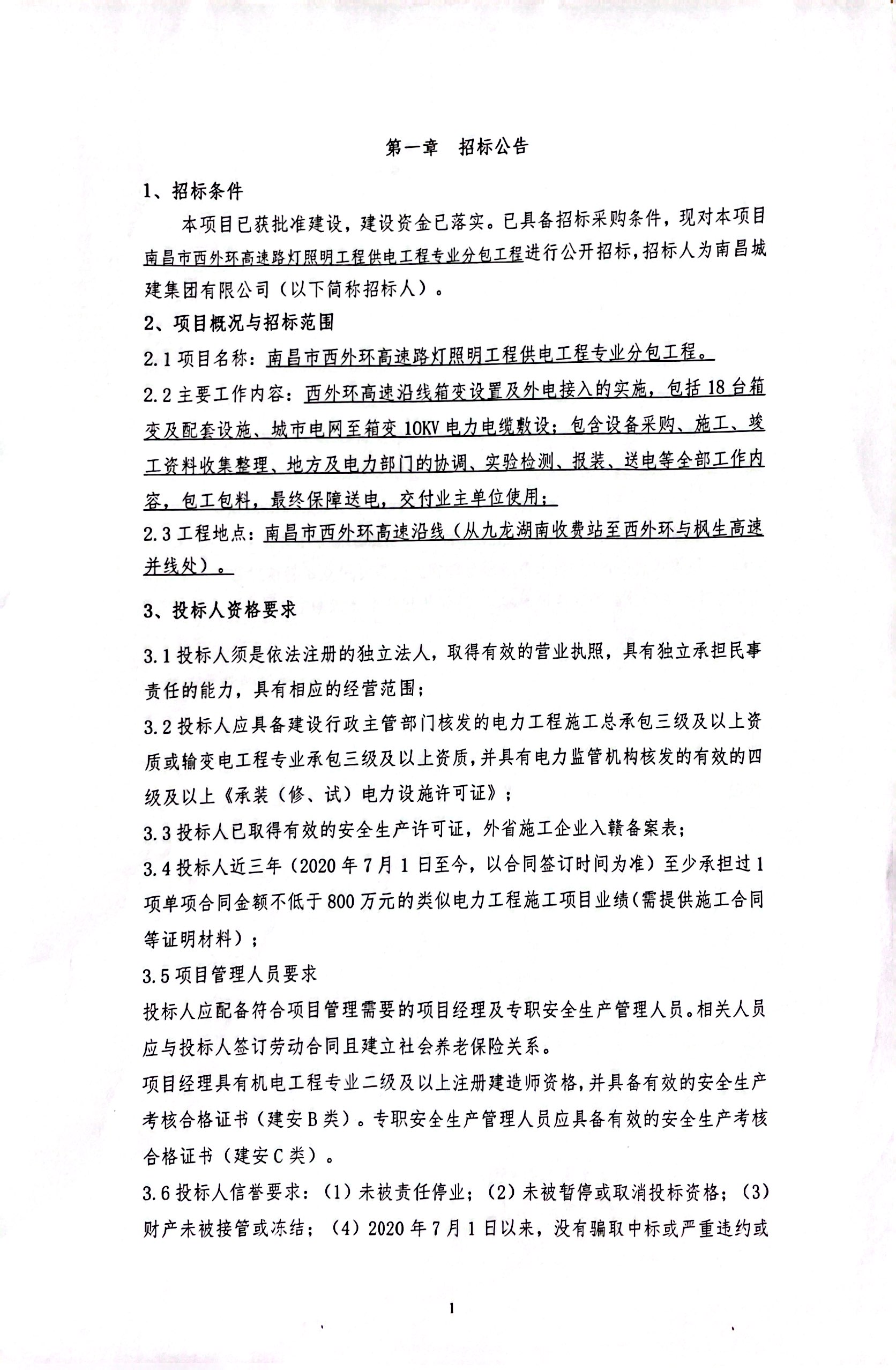 2.1项目名称:南昌市西外环高速路灯照明工程供电工程专业分包工程。