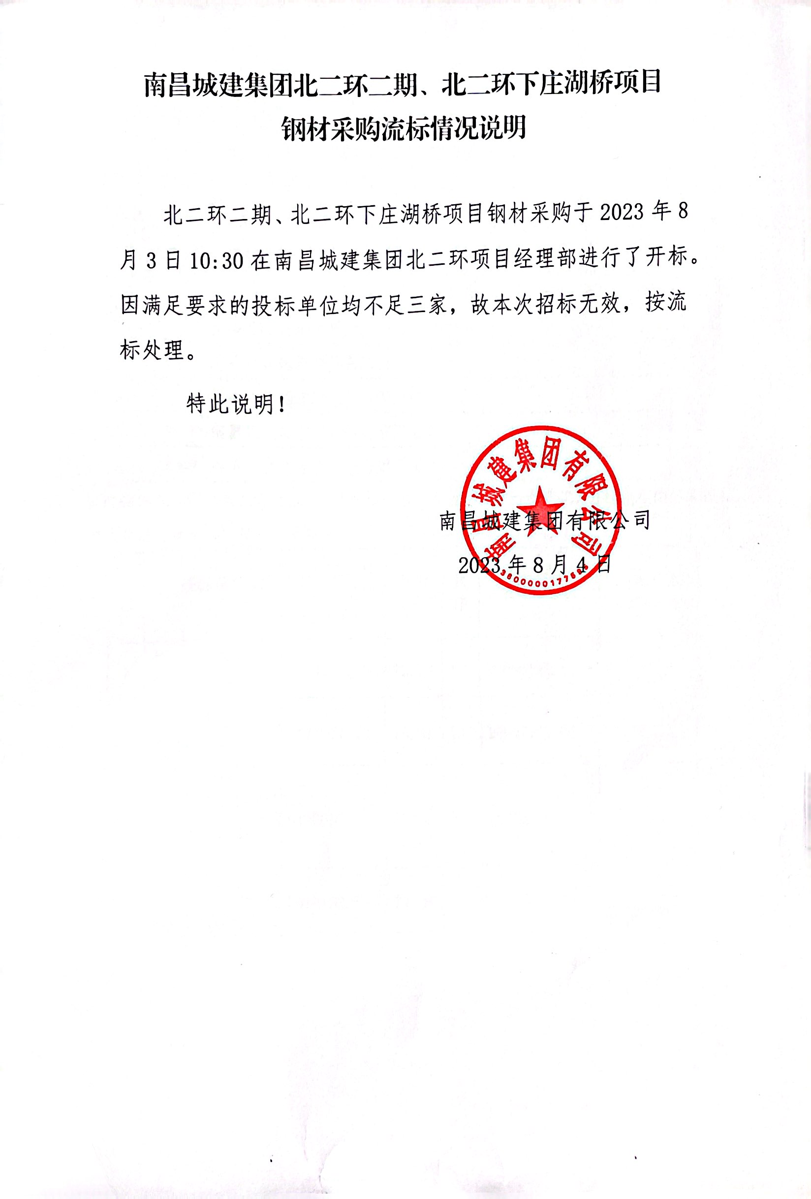北二环二期、北二环下庄湖桥项目钢材采购于2023年8月3日10:30在必赢亚州242.net集团北二环项目经理部进行了开标。因满足要求的投标单位均不足三家,故本次招标无效,按流标处理。