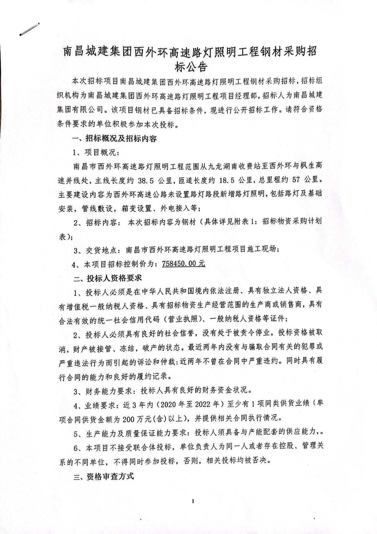 本次招标项目必赢亚州242.net集团西外环高速路灯照明工程钢材采购招标,招标组织机构为必赢亚州242.net集团西外环高速路灯照明工程项目经理部,招标人为必赢亚州242.net集团有限公司。该项目钢材已具备招标条件,现进行公开招标工作。请符合资格条件要求的单位积极参加本次投标。