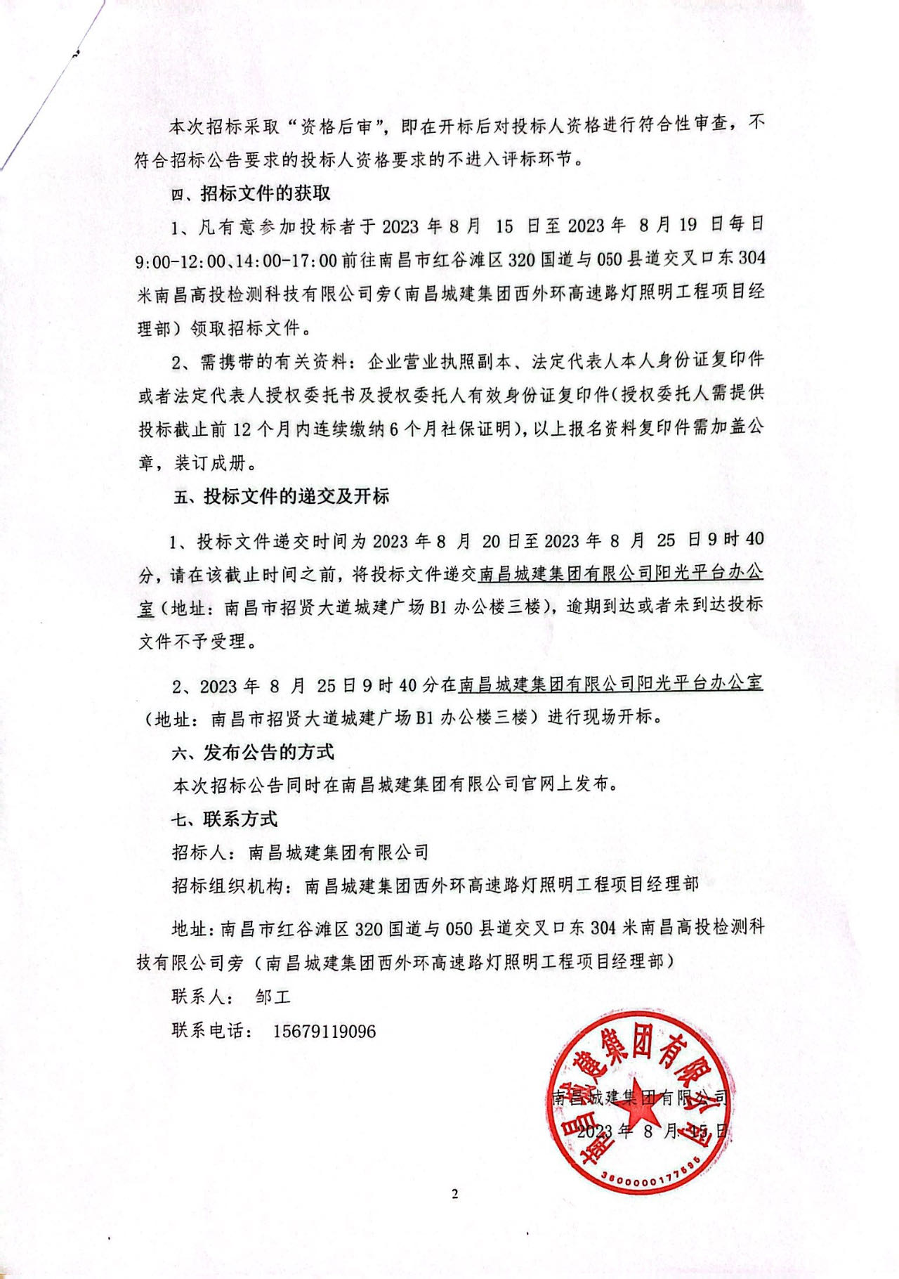1、凡有意参加投标者于2023年8月 15 日至2023年 8月19 日每日9:00-12:00、14:00-17:00前往南昌市红谷滩区320国道与050县道交叉口东304米南昌高投检测科技有限公司旁(必赢亚州242.net集团西外环高速路灯照明工程项目经理部)领取招标文件。
