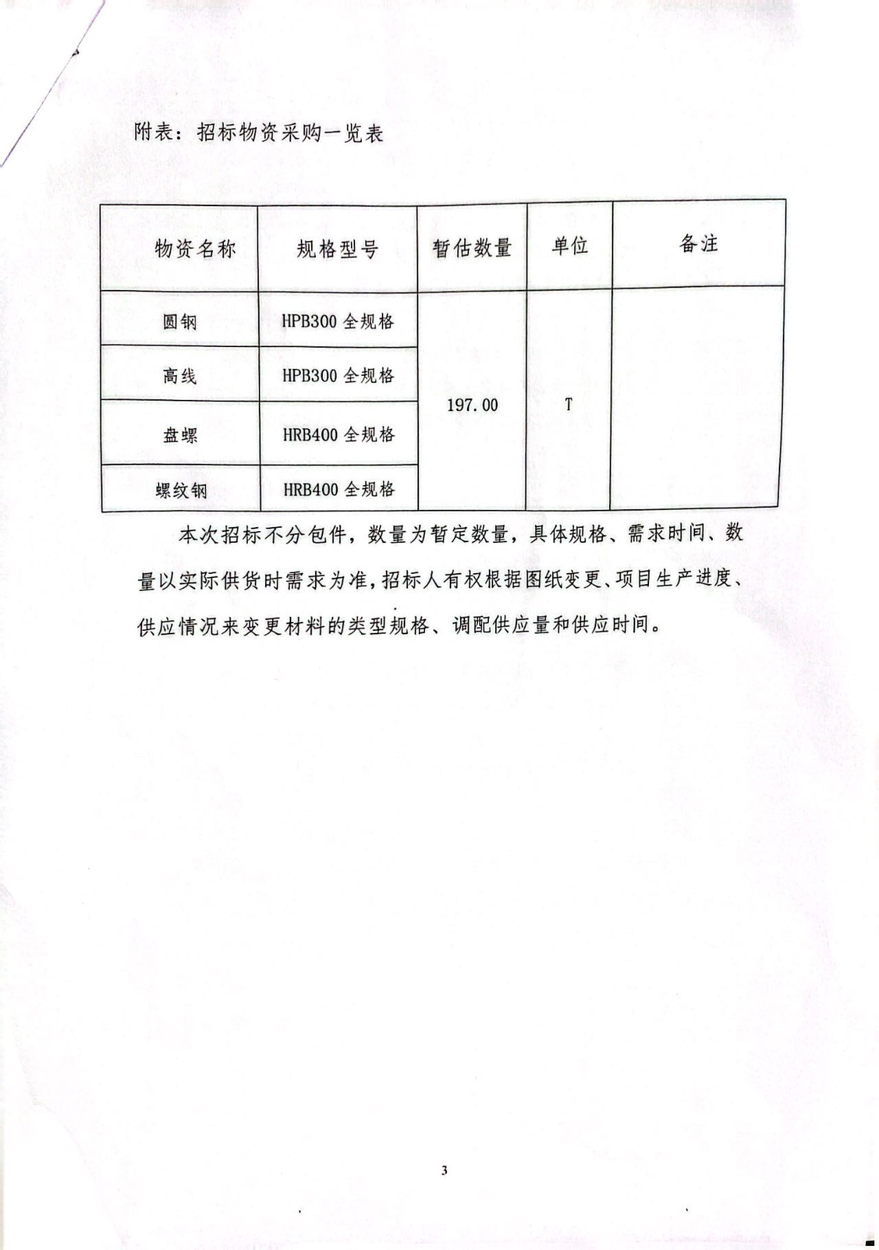 本次招标不分包件,数量为暂定数量,具体规格、需求时间、数量以实际供货时需求为准,招标人有权根据图纸变更、项目生产进度、供应情况来变更材料的类型规格、调配供应量和供应时间。