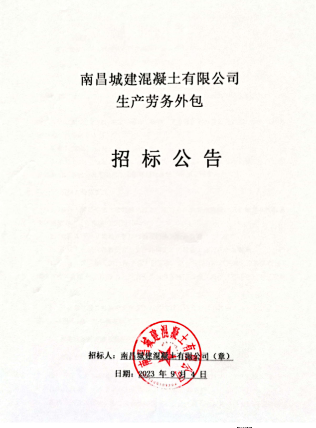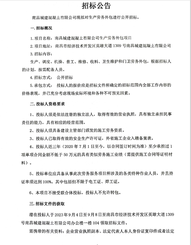 必赢亚州242.net混凝土有限公司现拟对生产劳务外包进行公开招标。