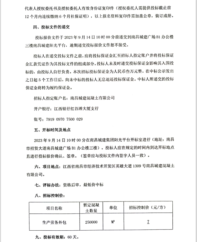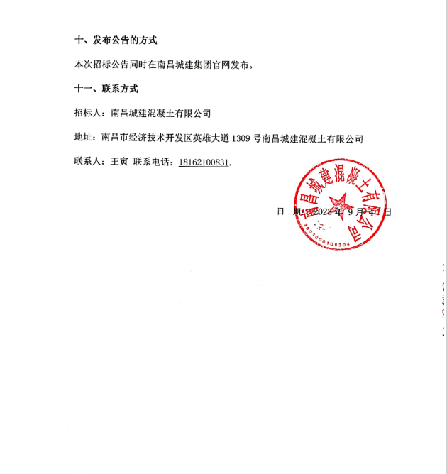 潜在投标人于2023年9月4日至9月8日至南昌市经济技术开发区英雄大道1309号必赢亚州242.net混凝土有限公司办公楼一楼104领取招标文件。